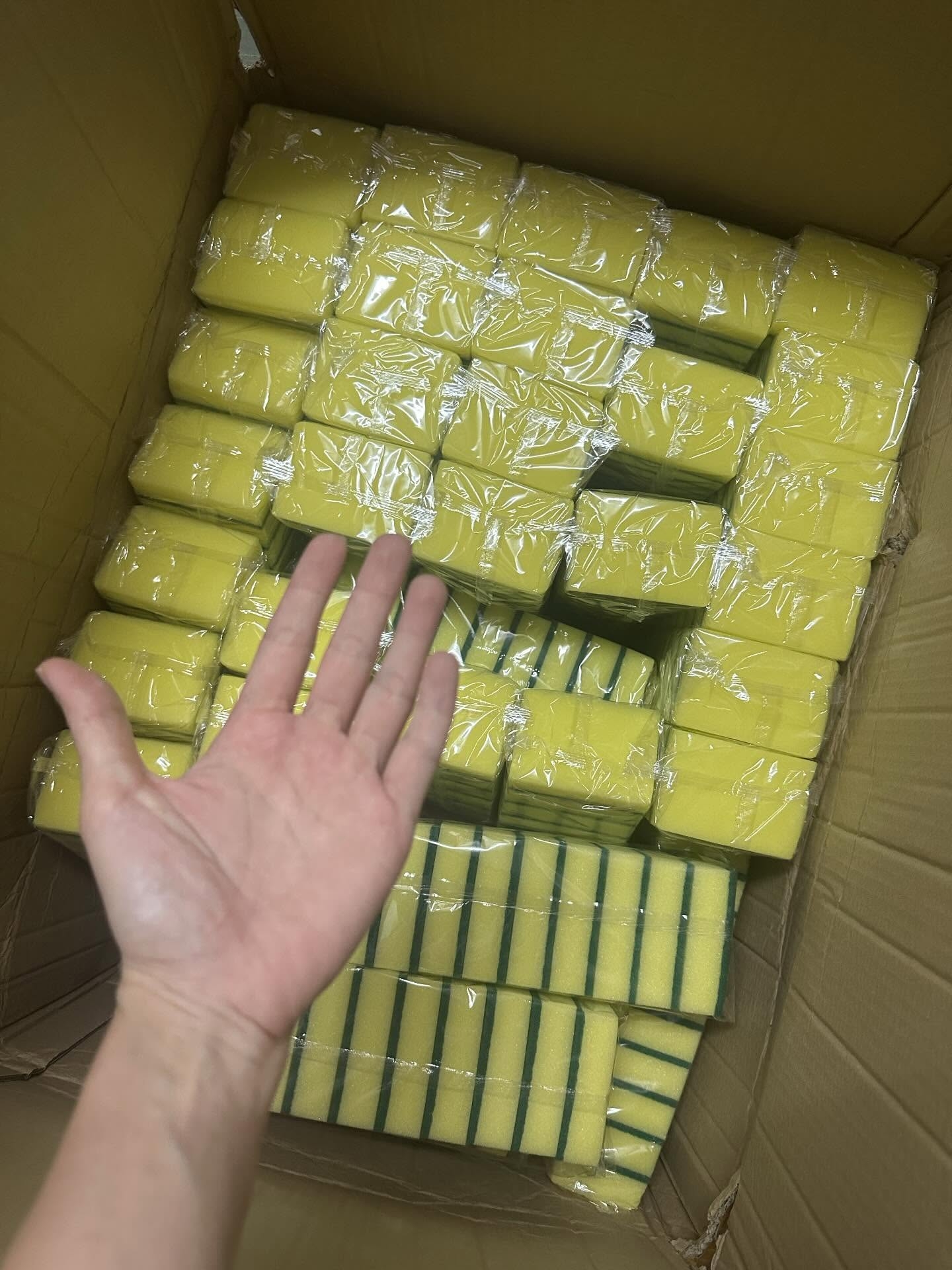 未料收貨時,事主形容父親「拖住大半個人咁高箱嘢返嚟」,開箱後更發現裡面足足有400件百潔布,「一打開崩潰咗,一大片黃色幾護眼」。