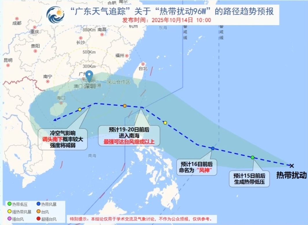 🌧️ 降雨與風力影響時段:預計在10月19日至21日期間,廣東沿岸及南海北部將出現大雨至暴雨,局部地區可能有強風或短時陣風。