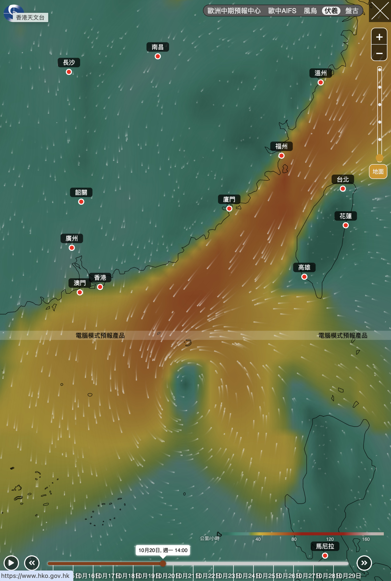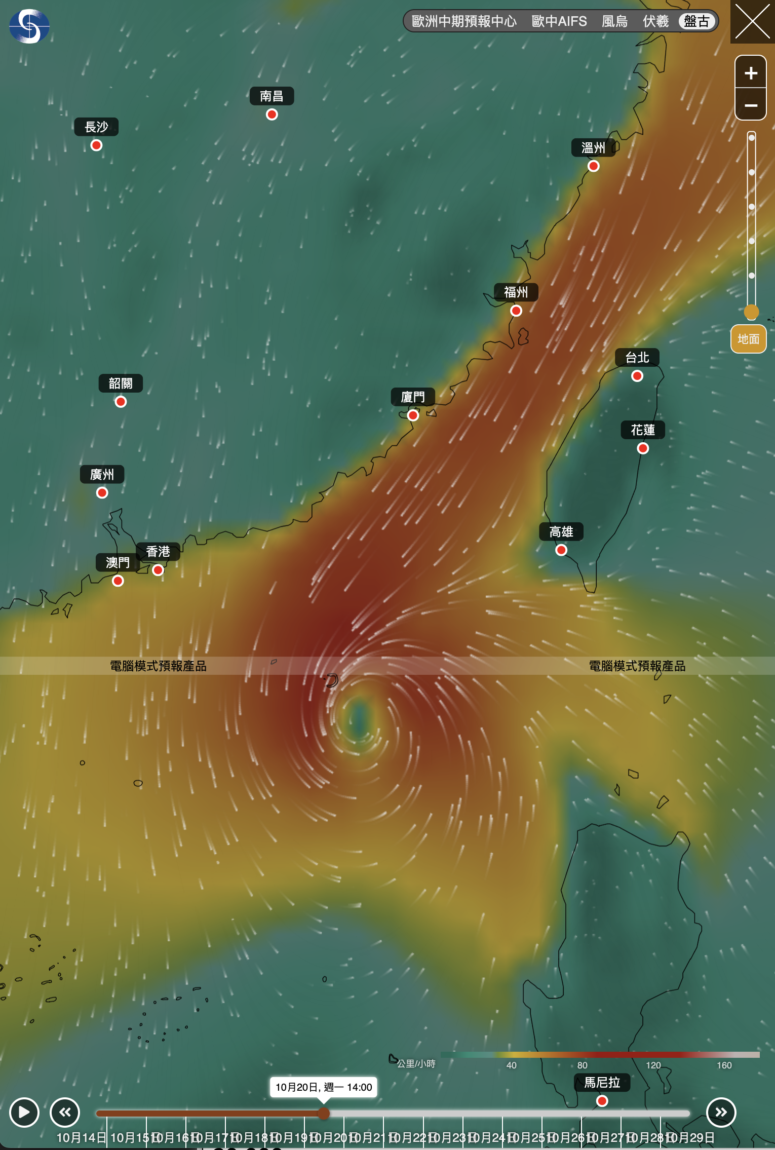 🟠 多個預報模式(包括風烏AI、盤古AI、伏羲AI、ECMWF、GFS)均預測其將進一步發展為強颱風級別。廣東氣象機構預計颱風強度可達13-14級。