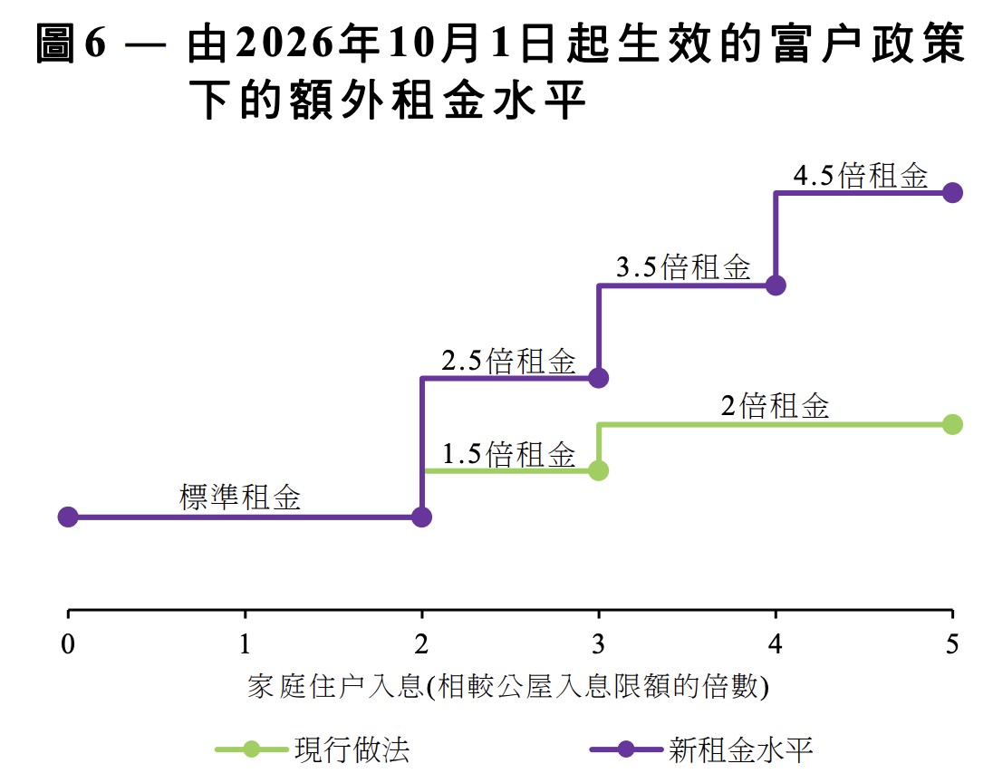 新政策規定,自2026年10月1日起,富戶租金級別將劃分為三層,分別為2.5倍、3.5倍及最高4.5倍租金,貼近市場水平。若住戶連續兩個申報期(即4年)入息超過限額4倍,將被強制遷出,以防長期違規佔用。