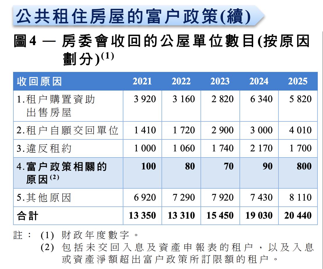 立法會秘書處資料研究組在10月2日公布《「房屋事務」數據透視》,顯示2024/25年度香港公屋「富戶」達40,040戶,按年急升12.7%,佔整體租戶4.9%,創近年新高。由於入息中位數持續上升而富戶門檻未調整,令更多住戶「被富戶」。同時,房委會因富戶政策收回800個單位,按年飆升近8倍,反映當局執法力度顯著加強。房屋局宣布將於2026年10月起優化政策,包括最高租金上調至4.5倍,並引入「連續超額入息4年須遷出」機制,回應社會對公平分配公屋資源的訴求。