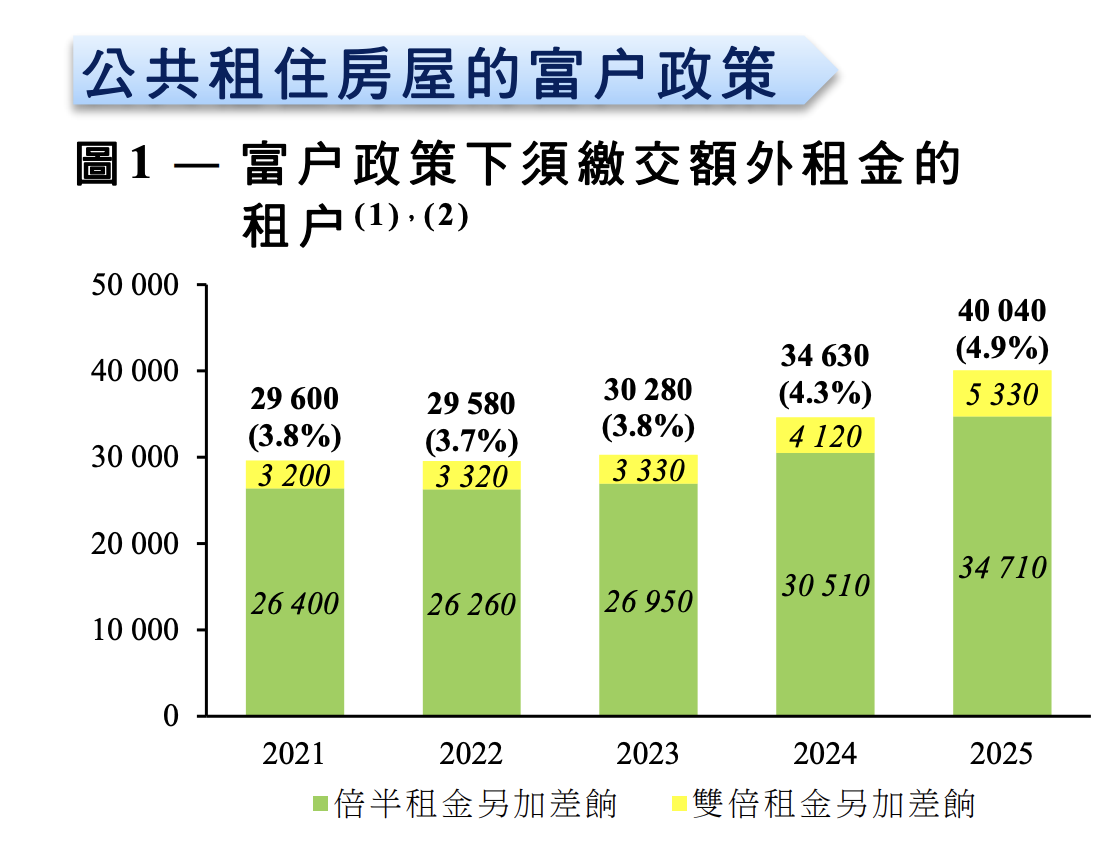 最新數據顯示,公屋富戶數目達40,040戶,按年增加12.7%,佔整體租戶4.9%。主要原因是近年入息中位數持續上升,而富戶門檻未有同步調整,令部分原本合資格住戶被歸類為「富戶」。