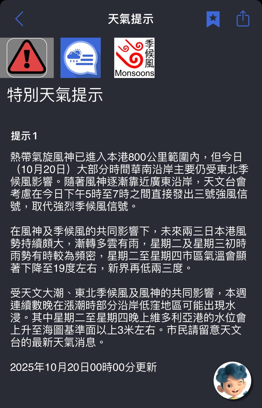 【香港打風/颱風/颱風風神/風神/李鈺廷/天氣預報/香港天文台/東北季候風】周一(10月20日)凌晨,香港天文台發出公告熱帶氣旋「風神」已進入本港800公里範圍內,隨着「風神」逼近香港,表示會考慮在今日下午5時至7時之間直接發出三號強風信號,預計今日下午將可能發出3號風球,並評估是否升級至8號。打工仔最關心當是「風神」能否升級至8號風球、享受一天額外的「風假」。天氣KOL李鈺廷在其Youtube頻度「李鈺廷講天氣」出片內分析了「風神」襲港的可能性,本文整理了李鈺廷的詳細分析,幫助大家掌握最新天氣動向。