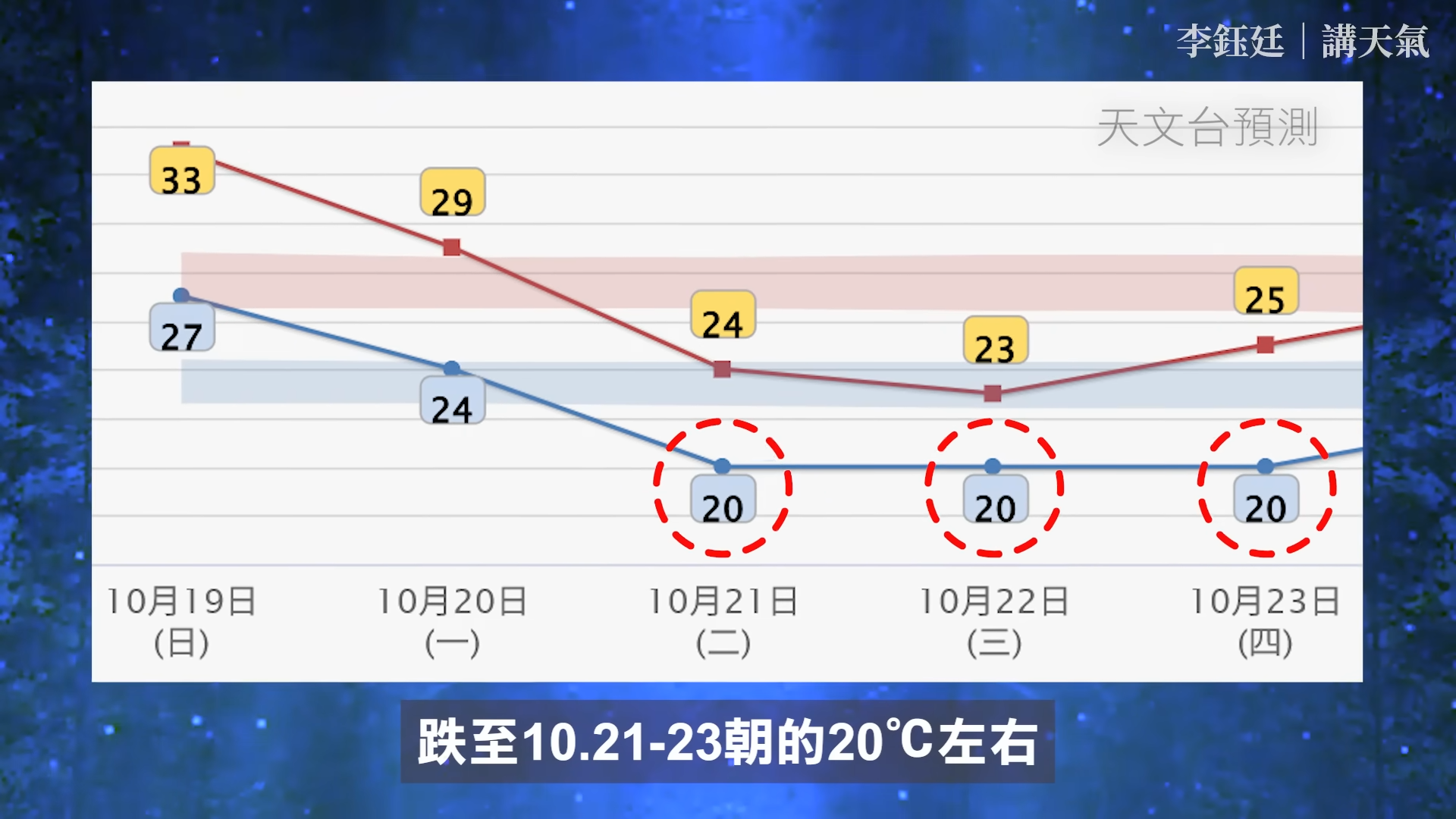 🟢「風神」雨帶的降雨會引起蒸發冷卻效應,令氣溫下跌,李鈺廷表示會由10月19日的33°C,跌至10月21-23日早上的20°C左右,新界會再低2-3°C,連續幾日多雲、有雨及大風,容易帶走體溫,令人感覺更涼。
