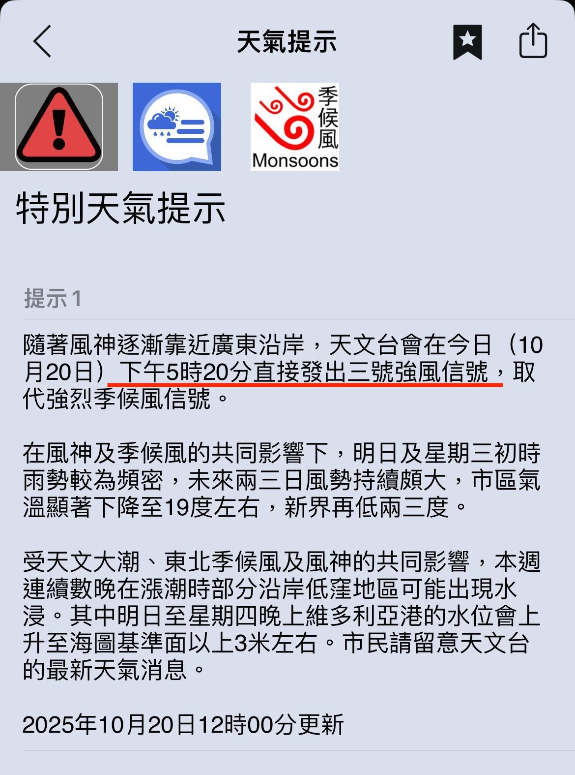 【香港打風/颱風/颱風風神/風神/天氣預報/香港天文台/東北季候風/8號風球/3號風球】今日(10月20日)中午12時,香港天文台發出公告表示「風神」逐潮靠近廣東沿岸,下午5時20分將直接發出三號強風信號。打工仔最關心當是「風神」能否升級至8號風球、能否享受一天額外的「風假」?氣象網站「MET WARN 天氣預警」最新評估指,天文台發出八號烈風或暴風信號的機會屬「低」,因風神今晚最接近本港時,仍與香港仍保持約400公里距離 ,雖然主烈風區不會覆蓋本港。
