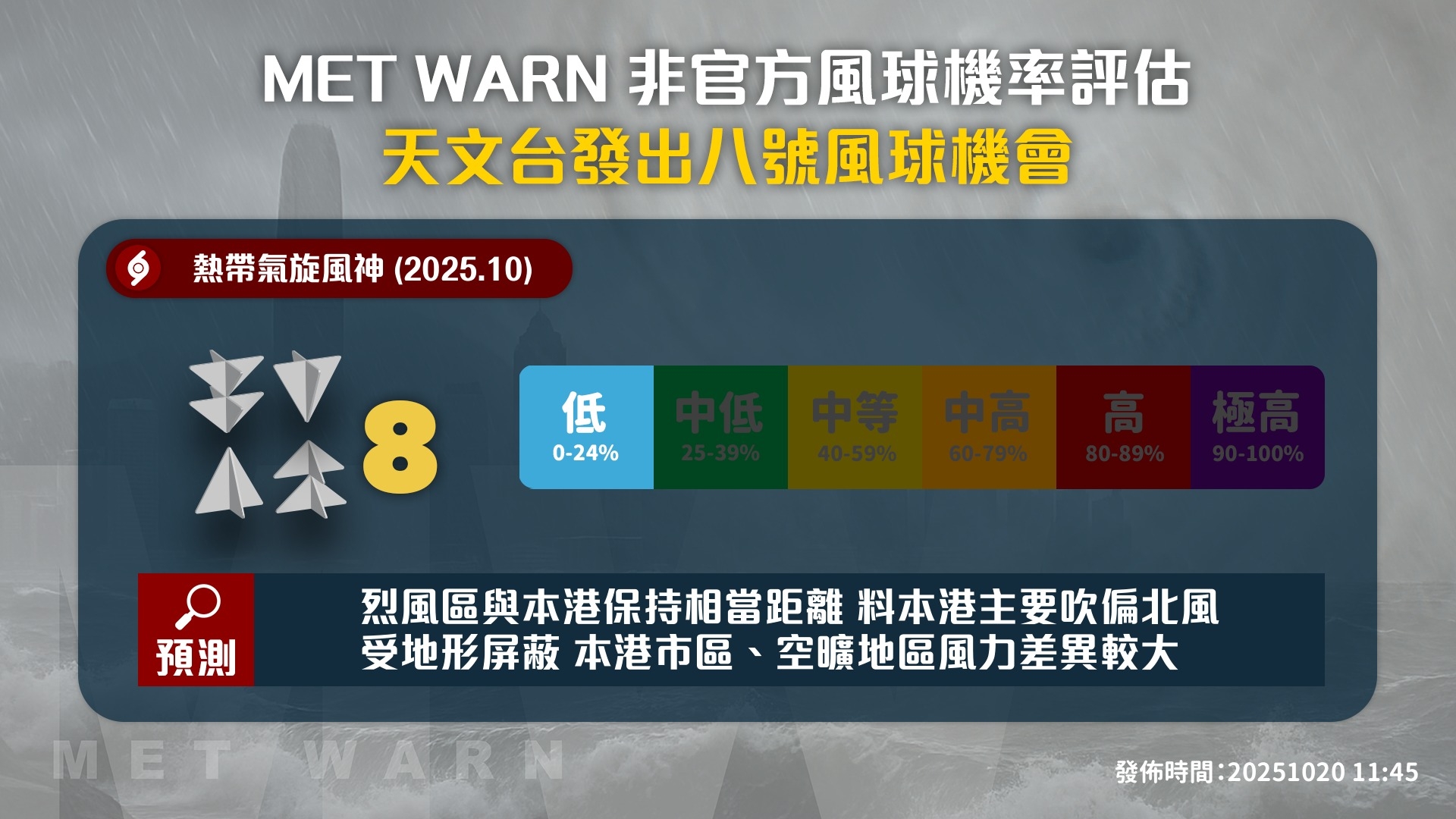 🟣 MET WARN 表示根據當前氣象資料,「風神」造成香港達烈風程度風力的機率較低,天文台不太可能發出八號信號。