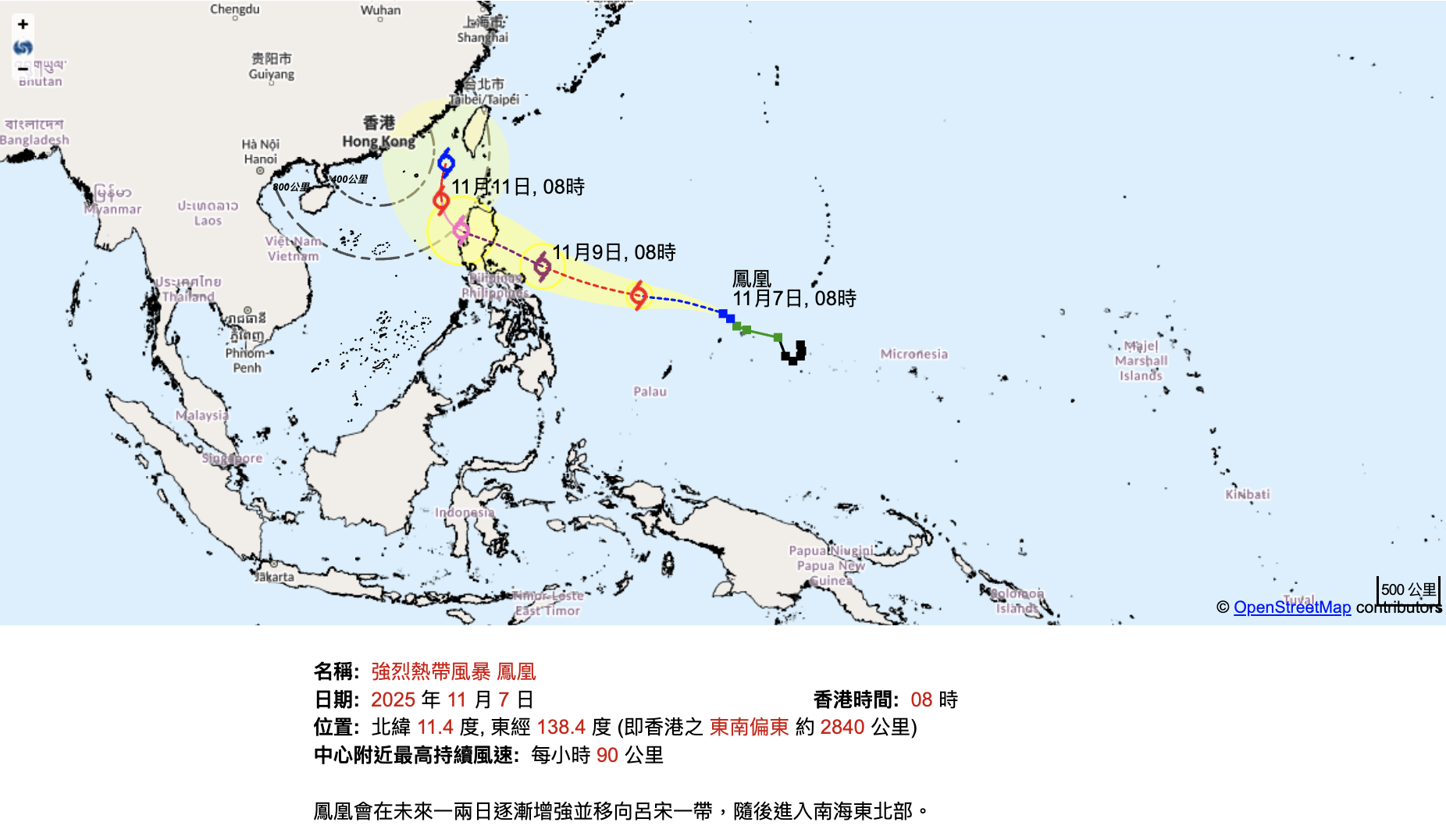 - 鳳凰颱風11月初形成後會增強,移動至菲律賓附近,再北轉進入南海東北部,逼近香港和台灣。風速預測達強熱帶風暴級。路徑轉向受季候風和高壓影響,仍有不確定性
