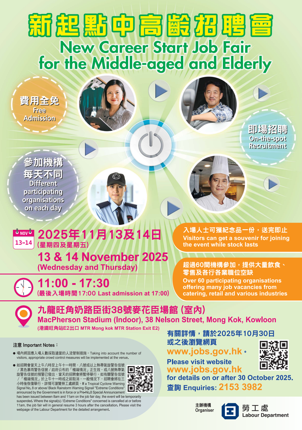 【香港招聘會/中高齡就業機會/新起點中高齡招聘會2025/勞工處招聘會/免費招聘活動/失業/搵工/裁員/中高齡就業】勞工處將於2025年11月13日至14日在旺角麥花臣場館舉辦「新起點中高齡招聘會」,為中高齡人士提供超過2,800個職位空缺,涵蓋飲食、零售、物業管理及多個熱門行業。招聘會參與機構超過60家,職位多為全職,月薪穩定,部分職位毋須相關經驗,適合有志重返職場或轉職的中高齡求職者,費用全免,入場更可獲禮物一份。