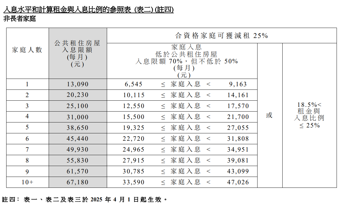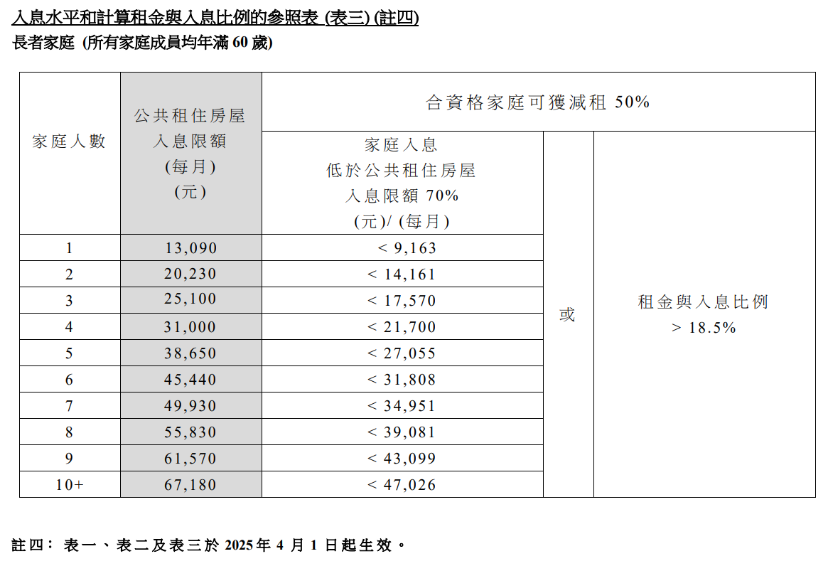 3/4額津貼住戶每月入息上限