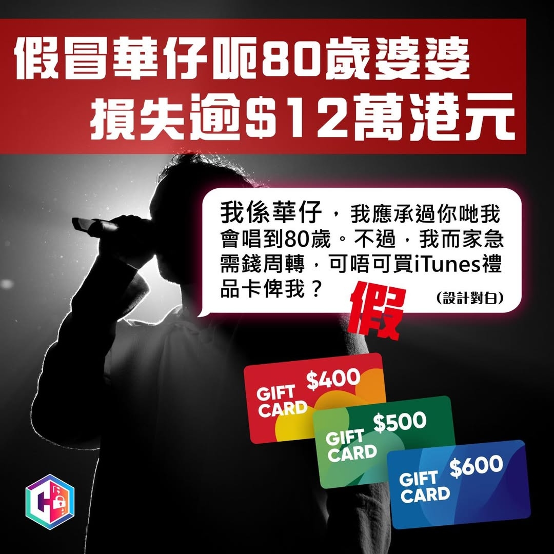 80歲婆婆是劉德華的資深粉絲,某天收到一條WhatsApp,訊息稱「華仔」現在加拿大,因資金周轉有難,需要她幫忙購買iTunes禮品卡。騙徒以急切語氣哄騙婆婆持續購買,婆婆在5個月內合共購入44張iTunes卡,並把禮品卡兌換碼透過訊息傳送給騙徒,結果損失約12萬港元。整個過程騙徒扮演成偶像,利用婆婆的信任和情感誘騙,屬典型網絡騙局。