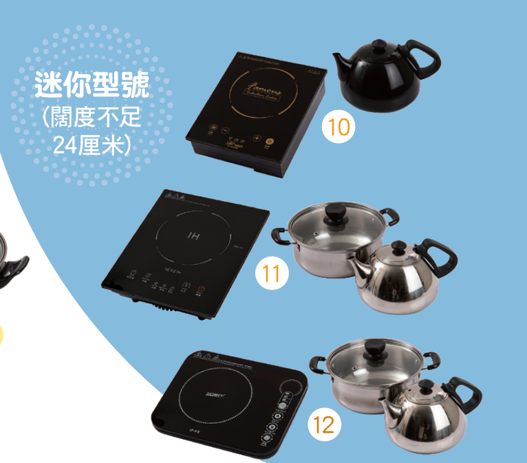 是次測試12款單頭電磁爐,全屬座枱式,售價由$279至$699,額定輸入功率由1,000W(瓦特)至2,100W,當中3款較迷你,闊度不足24厘米,額定功率亦較低。「SPT」、「豐澤fortress」、「美的Midea」及「家美Homey」的高度少於4.5厘米,較薄身。