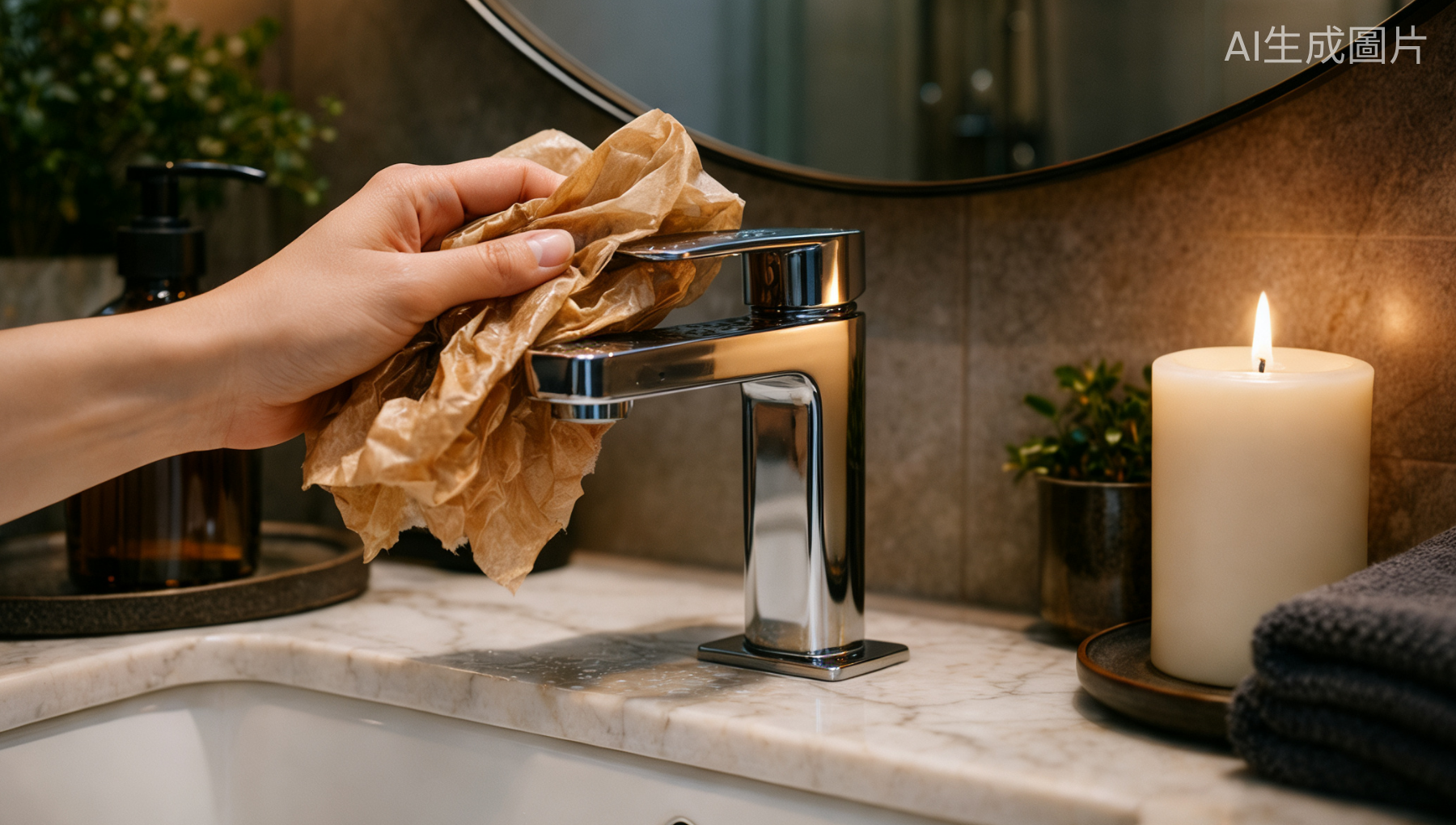 - 乾擦減少水漬再沉積 使用烘焙紙以乾擦方式清潔,能避免清潔過程中殘留水份,減少水漬與硬水礦物再次附著,塗層亦會在金屬表面留下薄薄保護膜,有助短時間內阻隔新水垢形成。