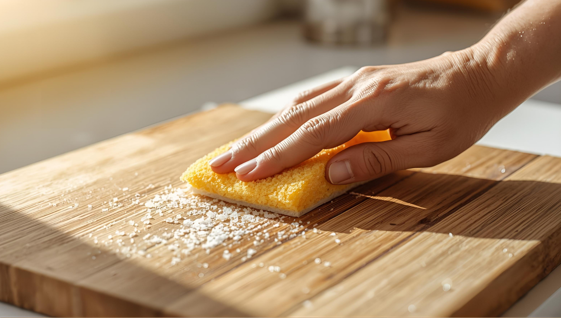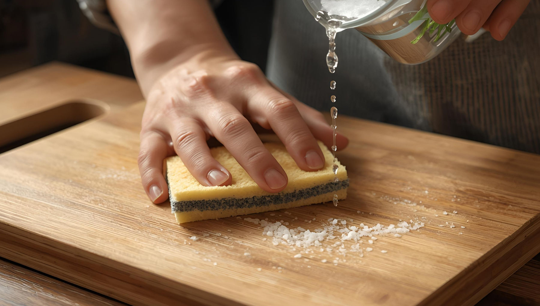 在砧板表面撒上適量粗鹽,用刷子或海綿來回刷洗,將「潺」與異味一併帶走。