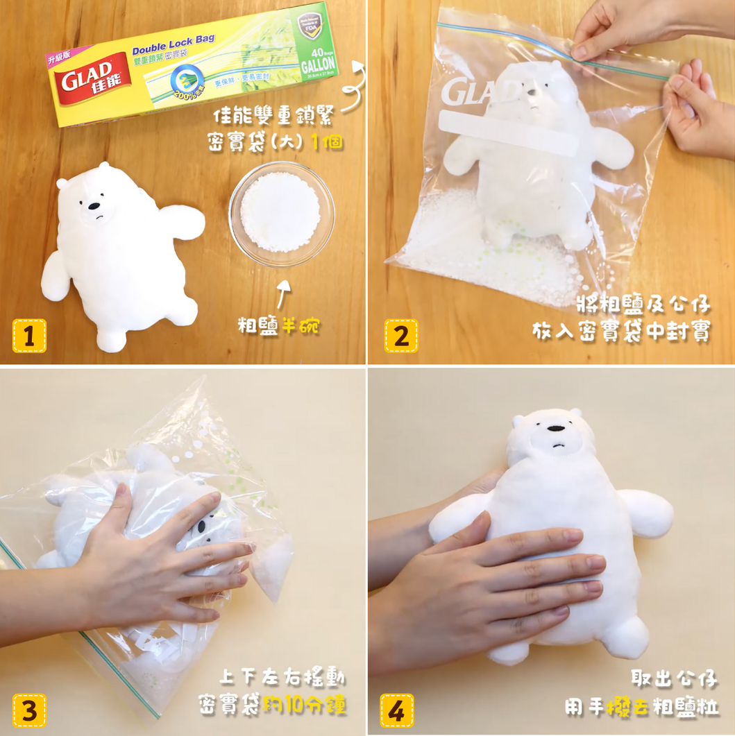 粗鹽產生摩擦力同吸附力,完美「乾洗」短毛公仔,去灰除塵超有效。