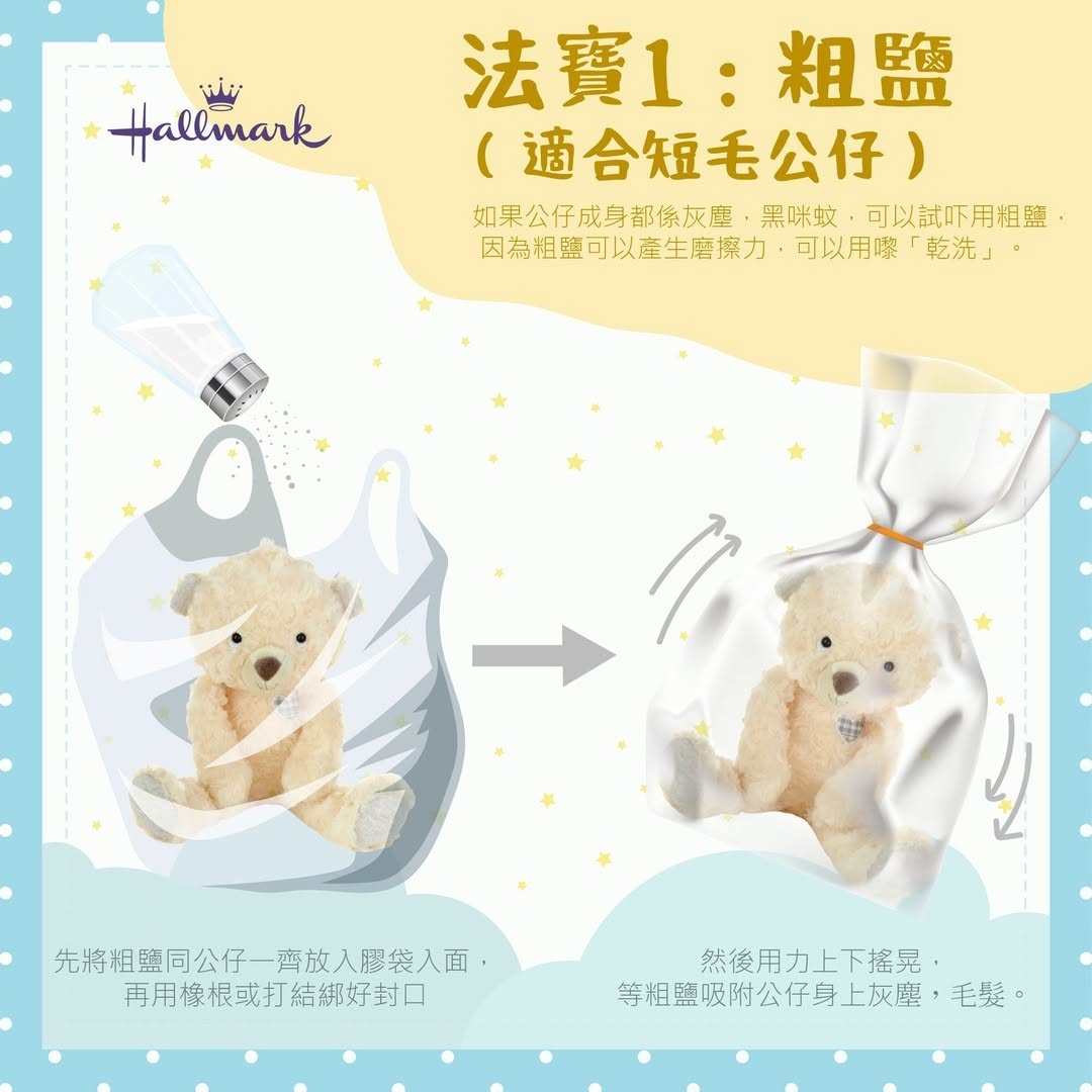 【家事常識/家居清潔/毛公仔清潔方法/除塵蟎】近年夾公仔店大流行,老中青都愛夾公仔,家中毛公仔愈夾愈多、愈買愈多,積塵又有塵蟎,清潔成大難題?尤其香港潮濕天氣,用水洗毛公仔晾極都唔乾,容易發霉孳菌。禮品店及毛公仔生產商Hallmark就分享超低成本「乾洗」方法,密實袋生產商佳能亦範用粗鹽為毛公仔除塵去污的方法,用粗鹽、爽身粉同小蘇打(梳打粉)就搞掂!成本低至幾蚊,唔使用大量水、不用洗潔劑,保證毛公仔洗完唔縮水同保持靚樣難,更毋懼潮濕天氣公仔晾極都唔乾。適合不同毛長同污漬的毛公仔使用。本文推薦你3大毛公仔清潔法寶。
