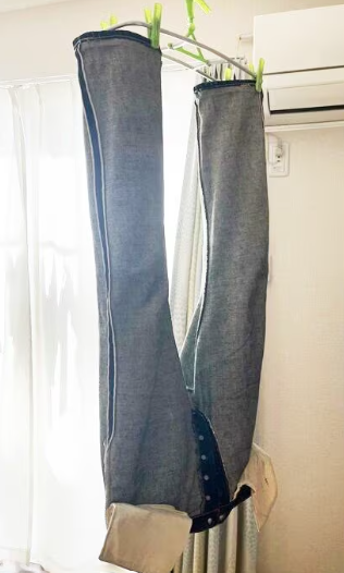 甩乾完成後,將衣物倒置(腰部朝下)懸掛在陰涼處,保持衣物內翻狀態。而將其捲成筒狀、腰帶朝下晾乾,可防止它被拉扯和起皺,亦要記得先拉伸布料邊緣。如晾乾後仍然扭曲,可用水噴一下,蓋上一塊布,然後用低溫熨斗熨平。