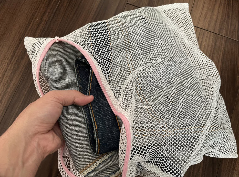 首先,將牛仔褲翻過來,放入洗衣網中,以防止洗滌過程中摩擦。但如不小心把食物或飲料灑在上面,最好把它放在洗衣網裡,外層朝上。然後將牛仔褲和洗衣液放入洗衣機,選擇「輕柔」或「手洗」模式。
