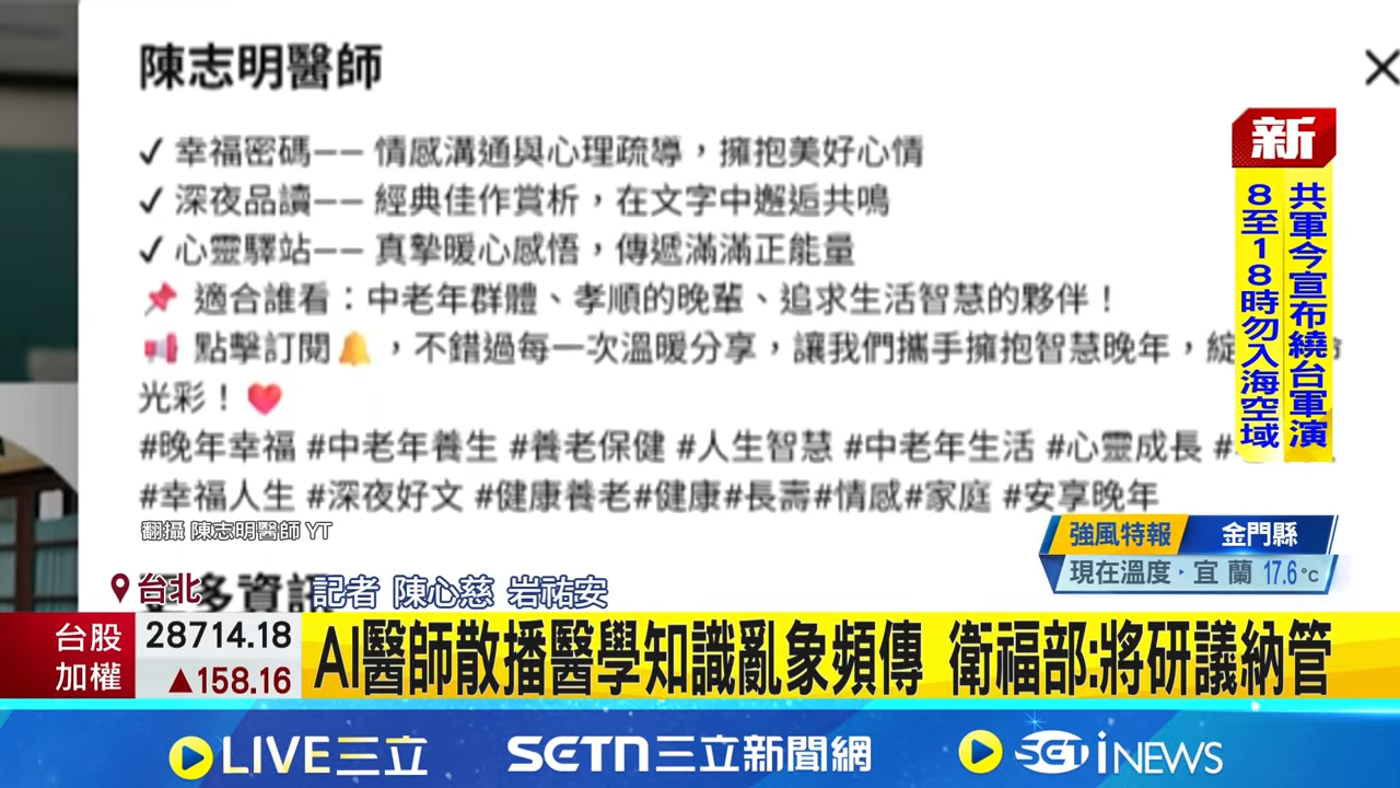 近日,台灣事實查核中心(TFC)調查後揭露,「陳志明醫師」頻道所有影片均為AI合成。起因是一條影片宣稱台北榮總(北榮)和台大醫院發現糖尿病致病元兇,並推出「細菌療法」治癒方法,引起疑慮。
