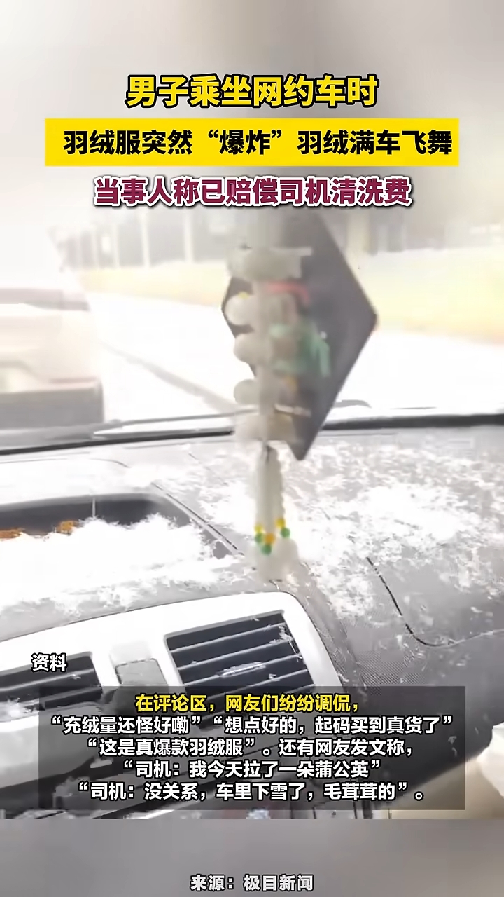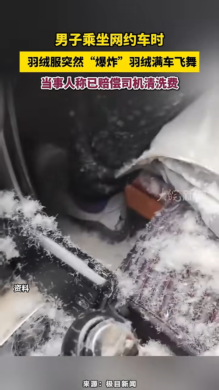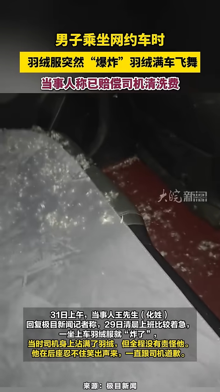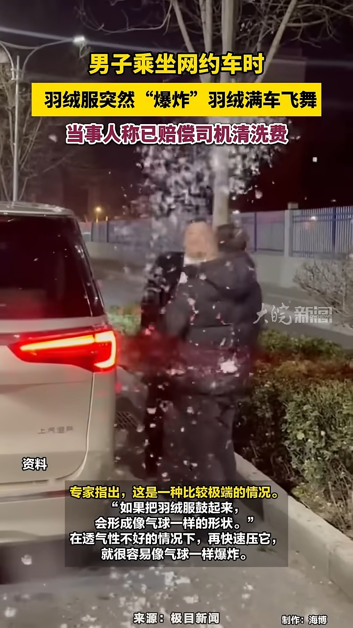 【羽絨/爆炸/的士/外套/車廂/司機/羽毛/專家/成因】綜合內媒報道,事發在2025年12月29日早上7時許,河北承德一名男網民發布影片,表示自己乘坐的士時,羽絨外套突然發生「爆炸」,令他感到不可思議。