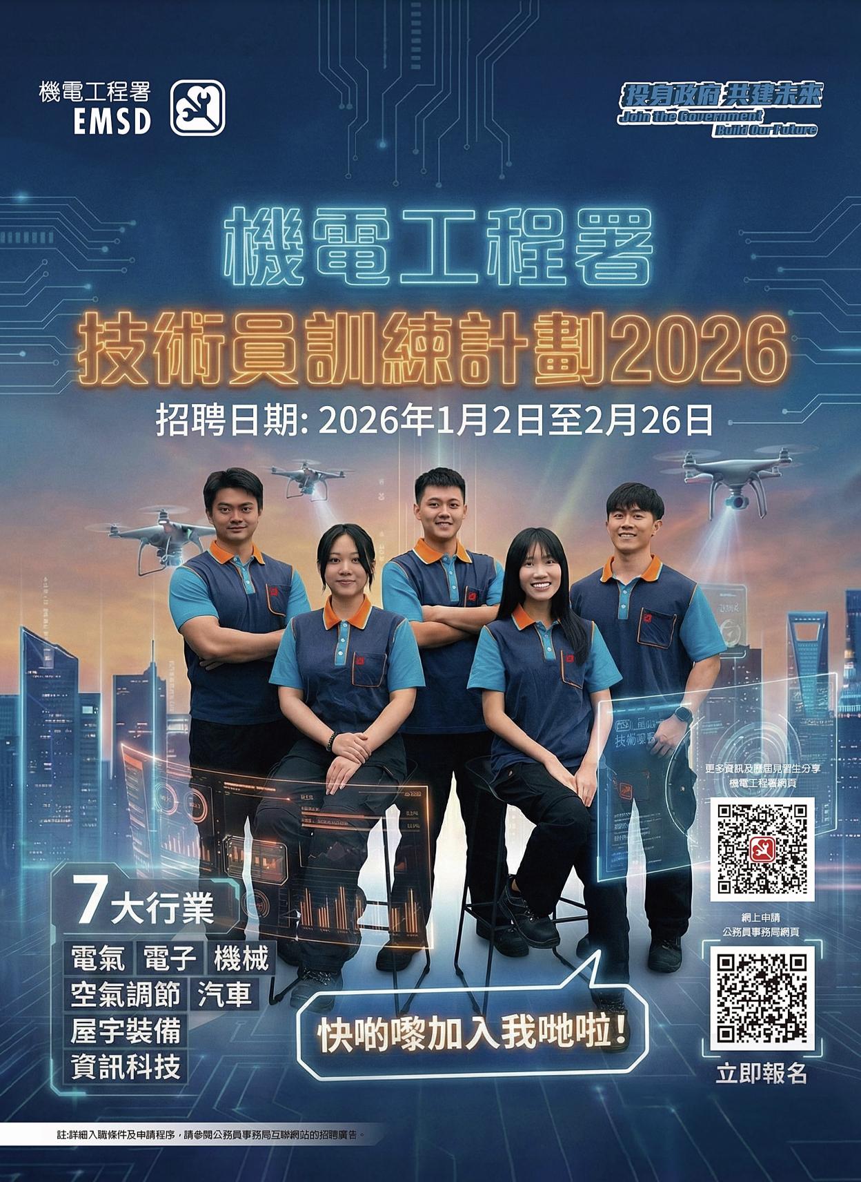 機電工程署自1955年起開辦技術員訓練計劃(前稱學徒訓練計劃),致力培養機電人才。2026年度計劃現正招生,涵蓋七大行業範疇,提供兩至三年制在職培訓。學員將接受專業導師指導,學習機電裝置的操作、保養、維修及改裝技能,主要服務政府部門及公營機構。計劃分為見習一級技術員及見習二級技術員,適合不同學歷人士申請,助你投身穩定政府工。