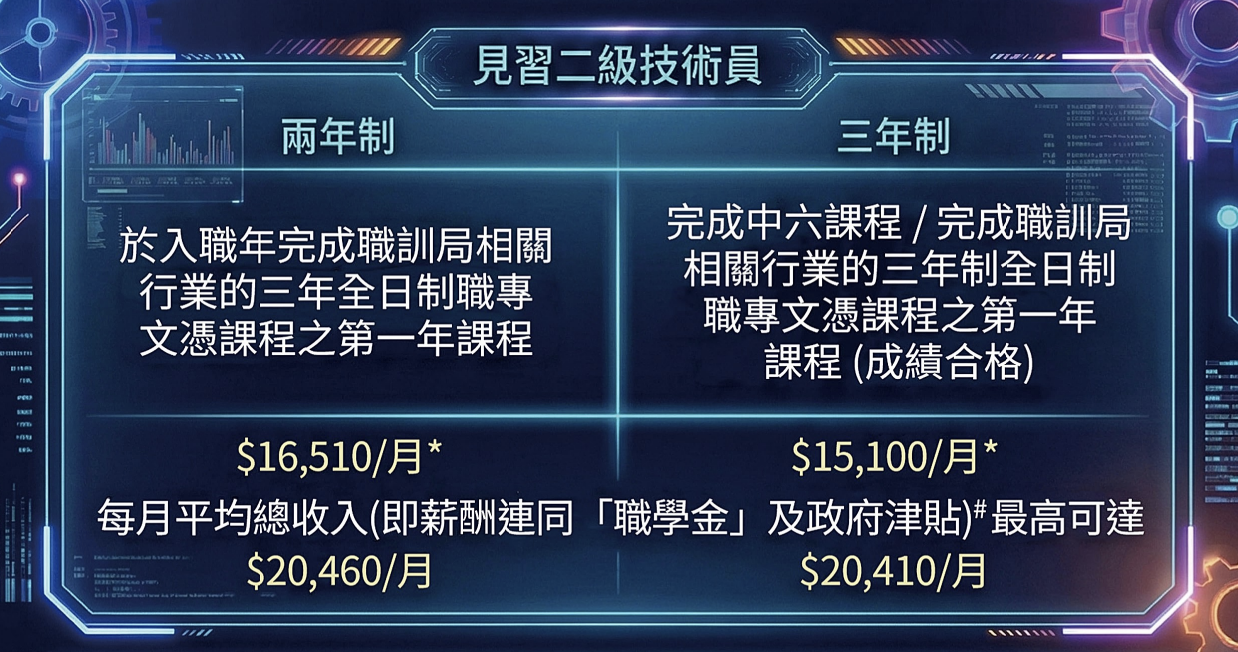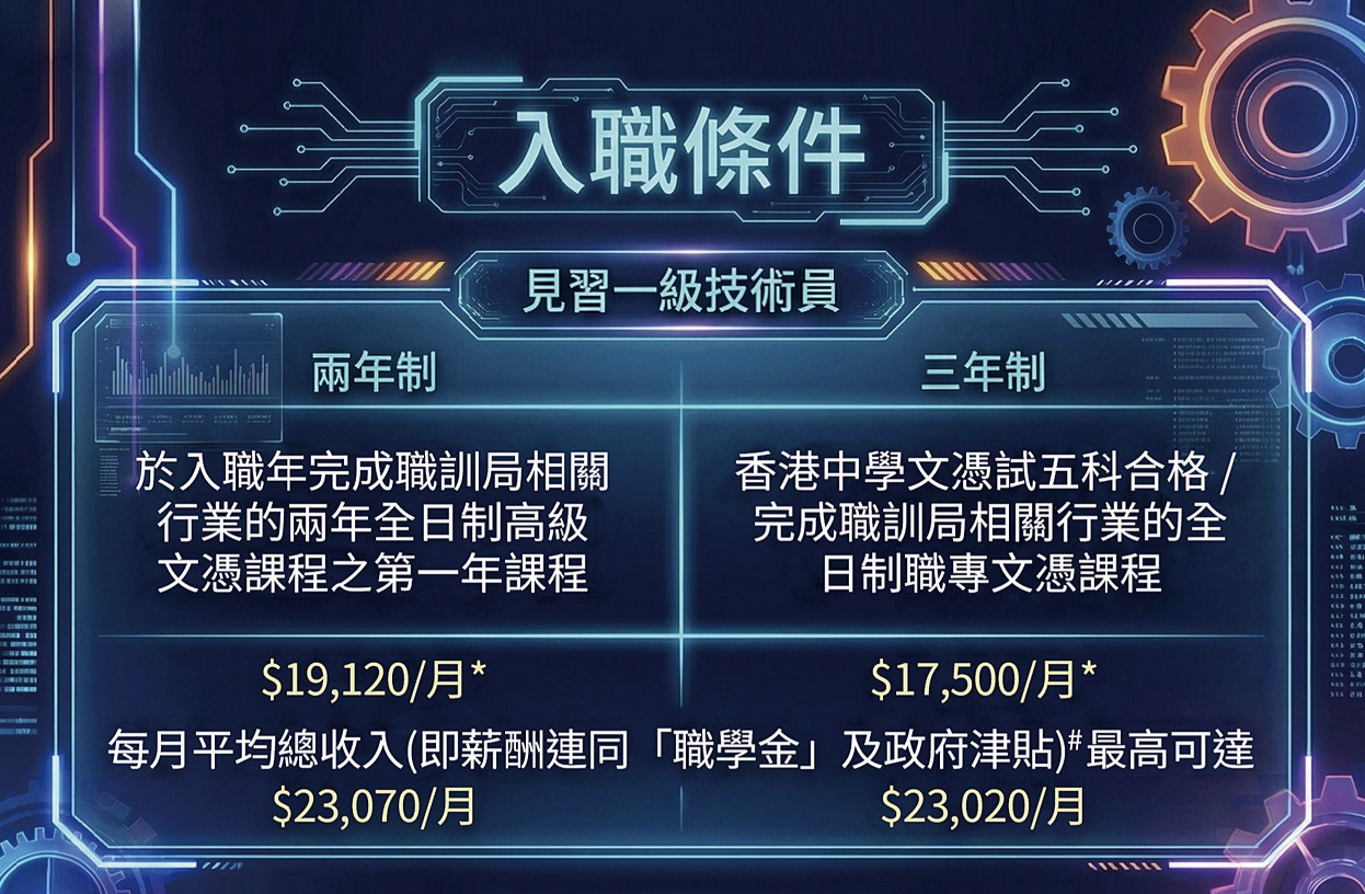 • 兩年制:2026年完成職業訓練局有關行業職專文憑首年課程。需中三程度中英語文能力。