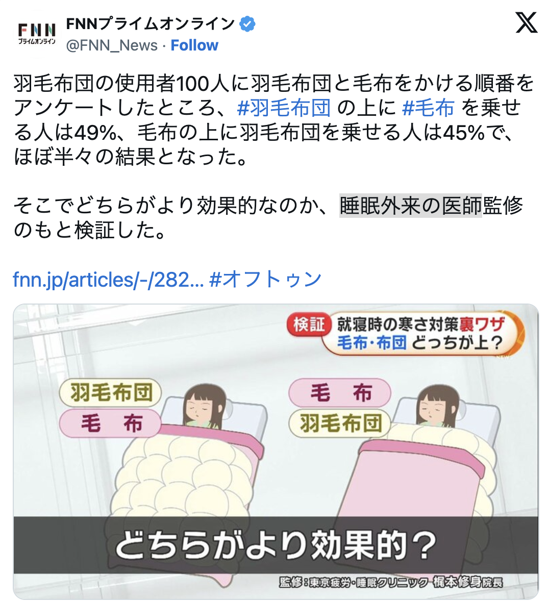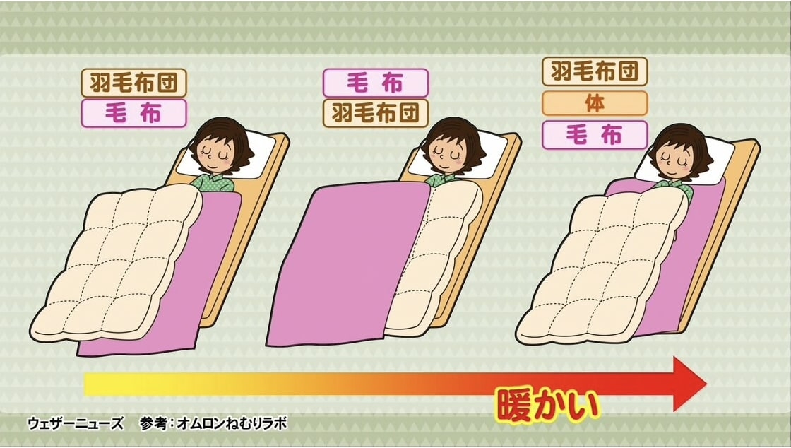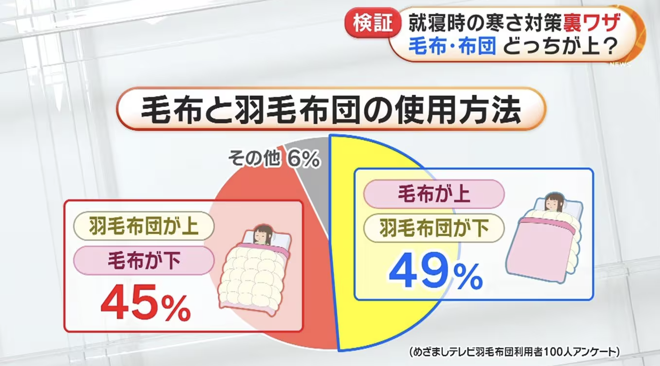 在寒冷的冬天,許多人會用羽絨被搭配毛毯保暖,但順序不同,效果大異。根據FNN調查有以下結果: