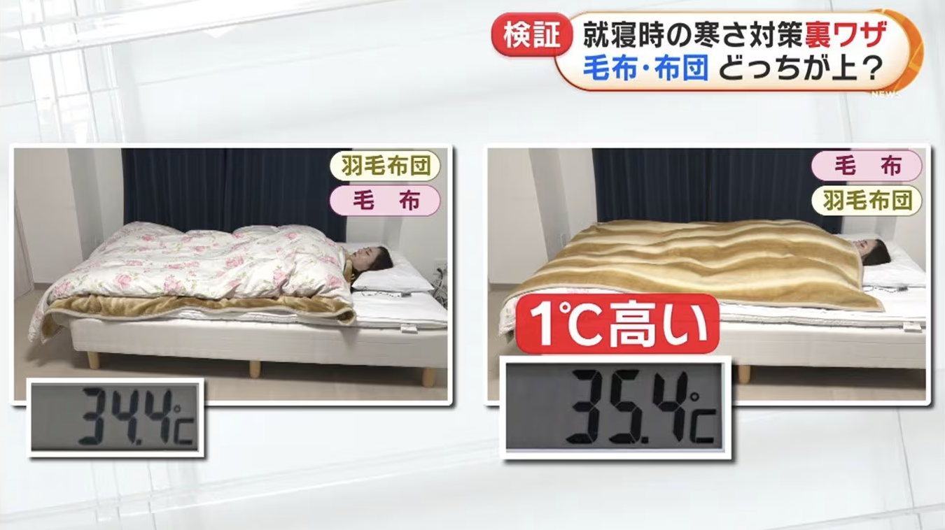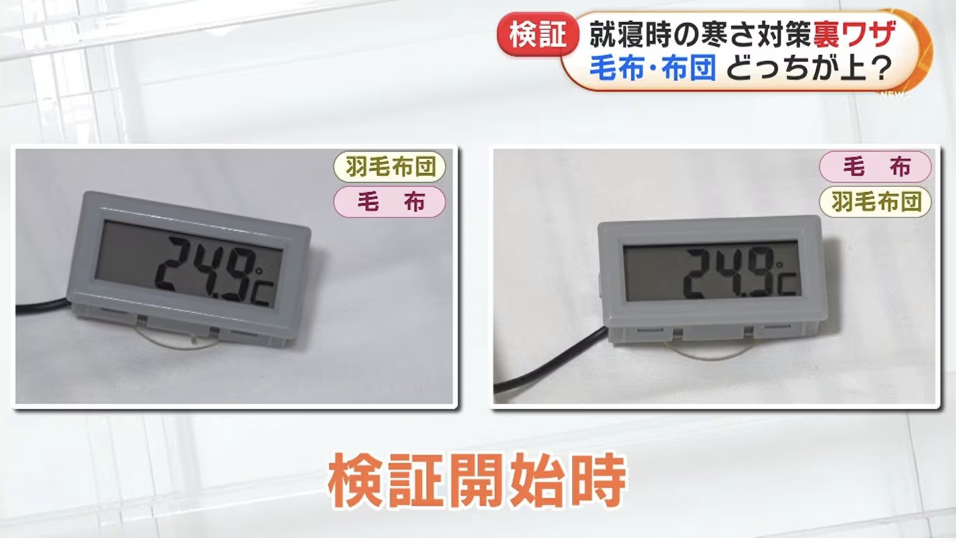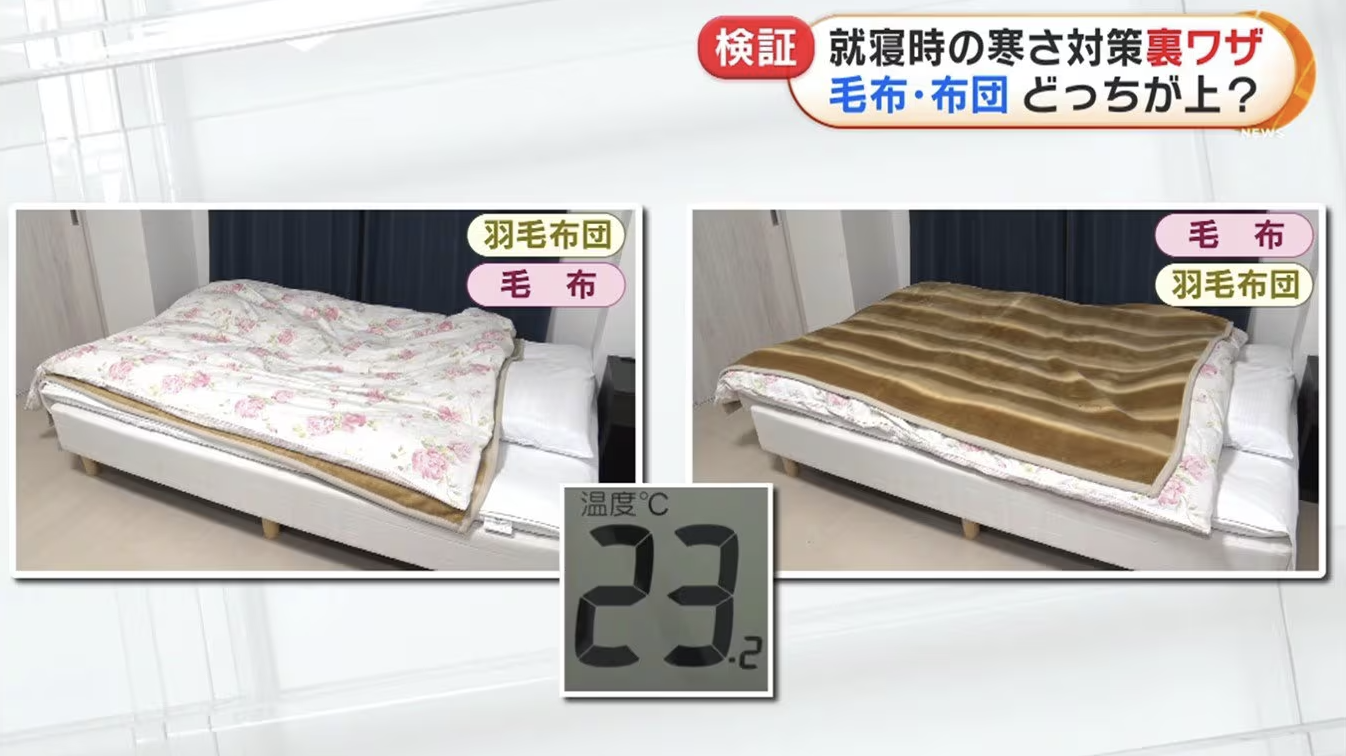 在梶本修身醫師監修下,FNN在室溫23℃的房間進行實驗。實驗開始,被子溫度均為24.9℃,受試者躺下後,測量30分鐘內的溫度變化。