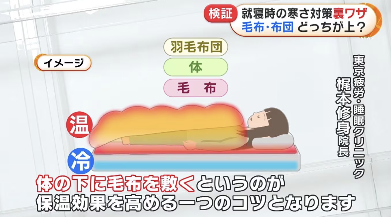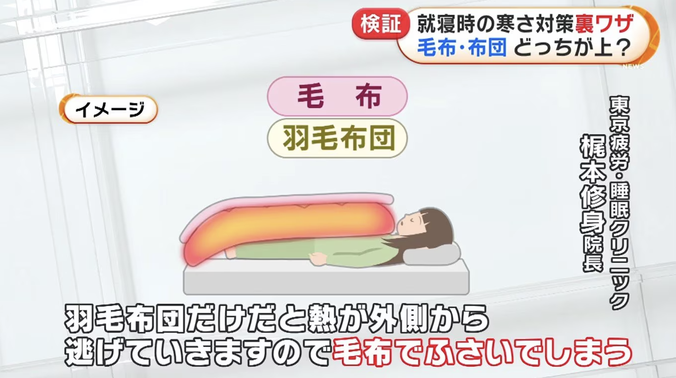 在於羽絨被的保溫效果極佳,能儲存身體熱量,但若直接暴露在外,熱氣易向上散失;用毛毯在上層封住熱量,便能防止散逸。若床鋪冰冷,在下方加毛毯也能阻擋冷空氣入侵,提升整體溫度。梶本醫師強調,這方法不只適用寒冬,還能改善睡眠品質。