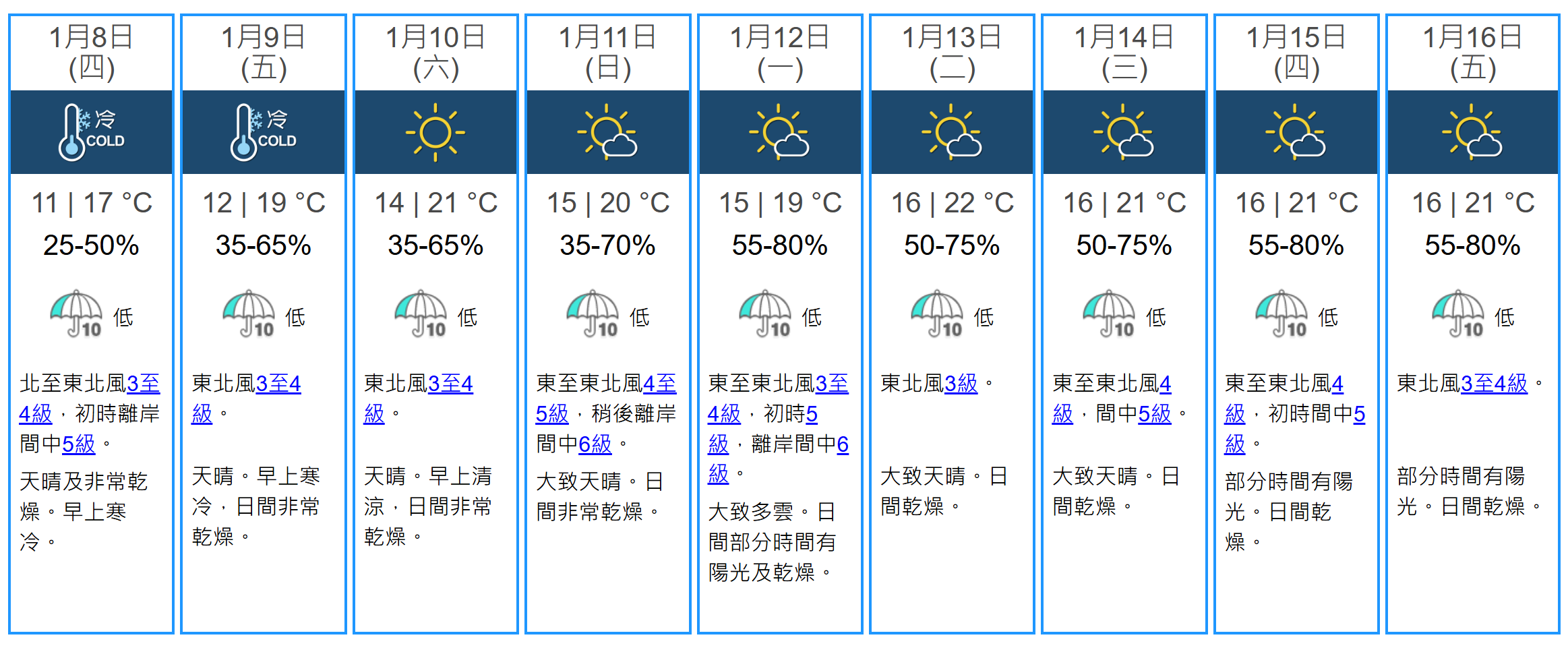 - 預計1月10日至16日,屆時華南近地區(包括香港)的低溫可能逼近5-8℃,香港以北更廣泛地區有可能降至0℃
