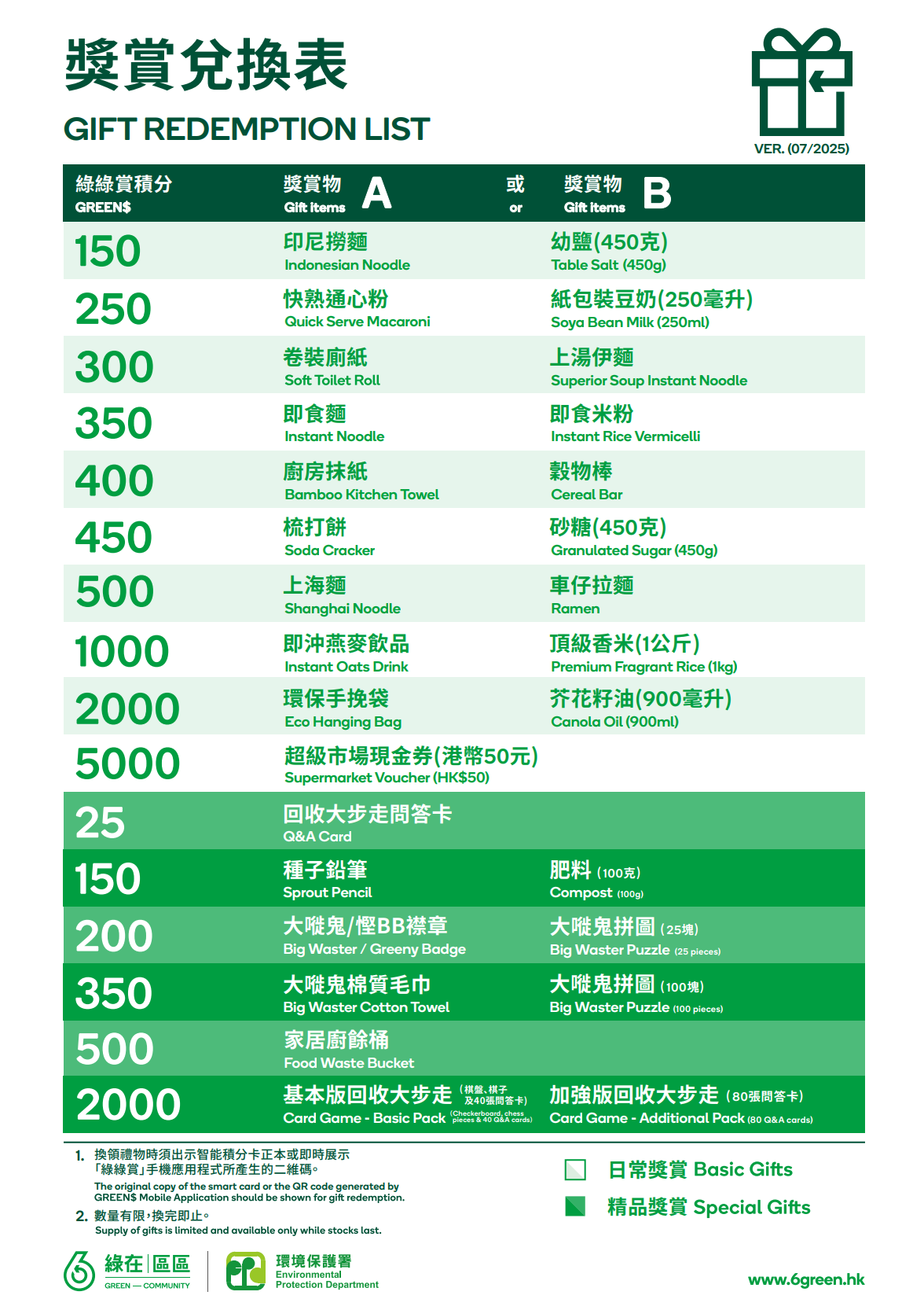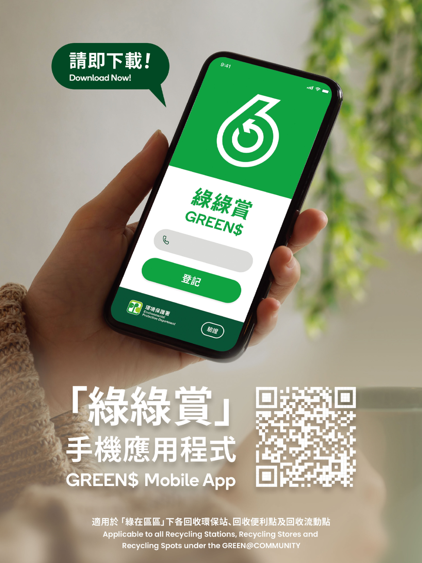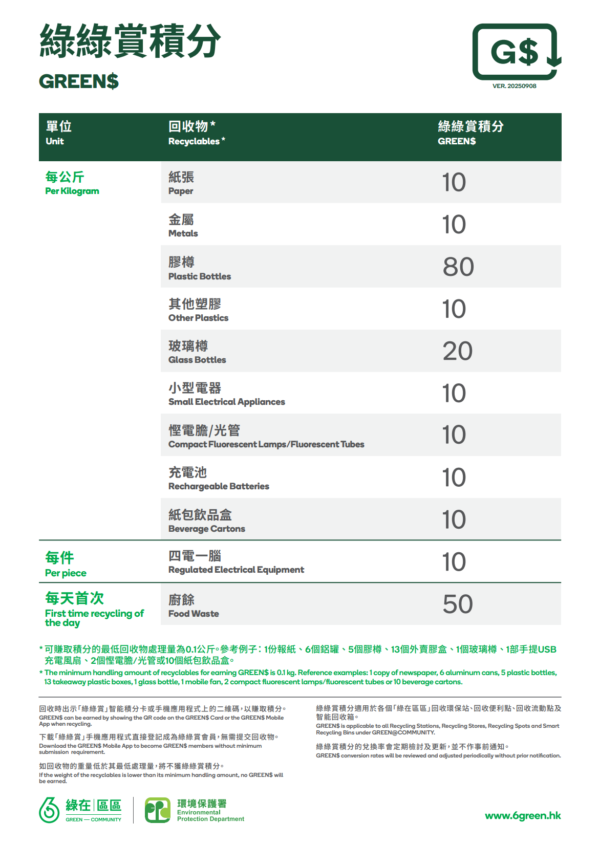 另外,市民使用智能回收設備提交回收物時,可以綠綠賞手機應用程式或綠綠賞積分卡賺取相應綠綠賞積分和換取獎賞,包括日常生活用品、糧油乾貨和環保產品。回收每件「四電一腦」或小型電器,可賺取10分。