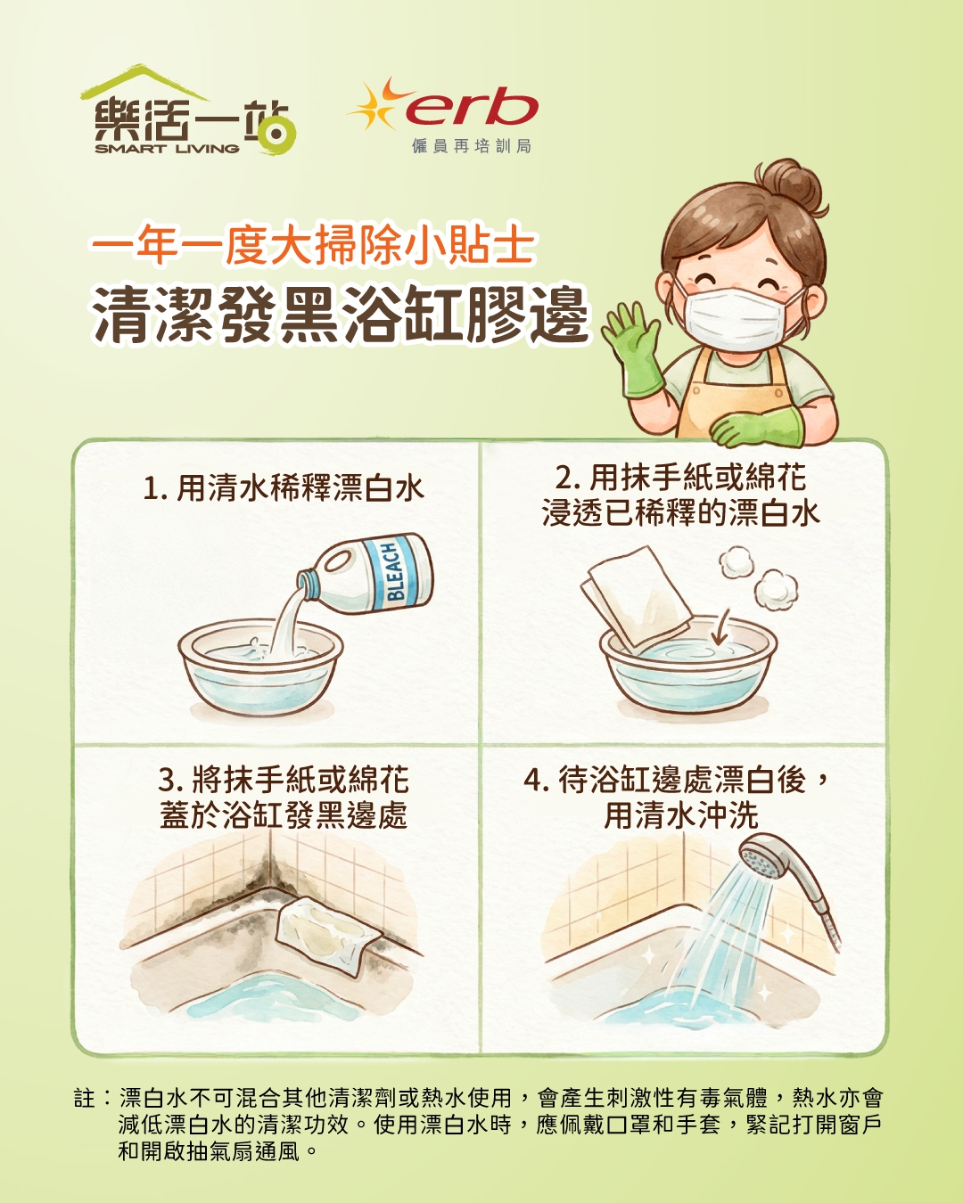 使用漂白水時,千祈唔好混合其他清潔劑或熱水,否則會產生刺激氣體或熱氣體,危險!如果浴缸邊霉菌太頑固,可重複步驟,但唔好過度使用。清潔後,記住保持浴室通風乾燥,預防霉菌再生。