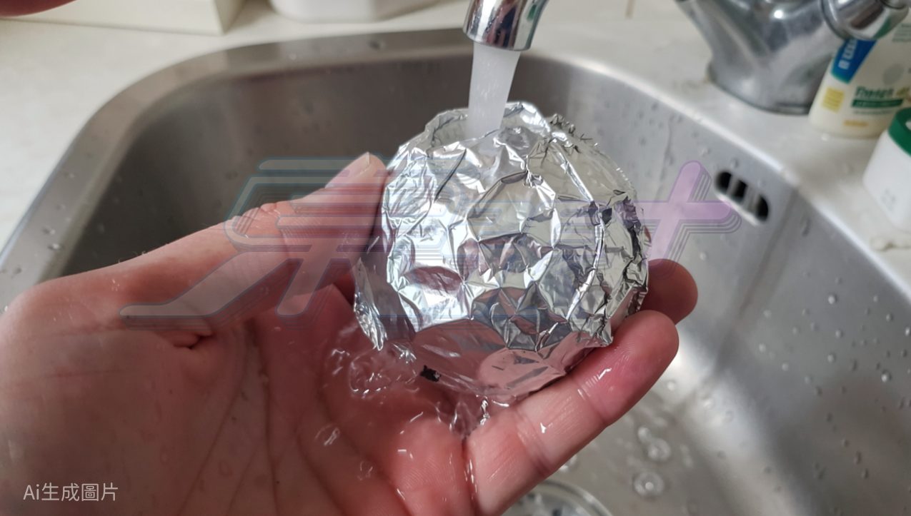 - 步驟2:弄濕錫紙 用清水濕透錫紙球,唔使加任何清潔劑。水係關鍵,幫助產生電化學反應。