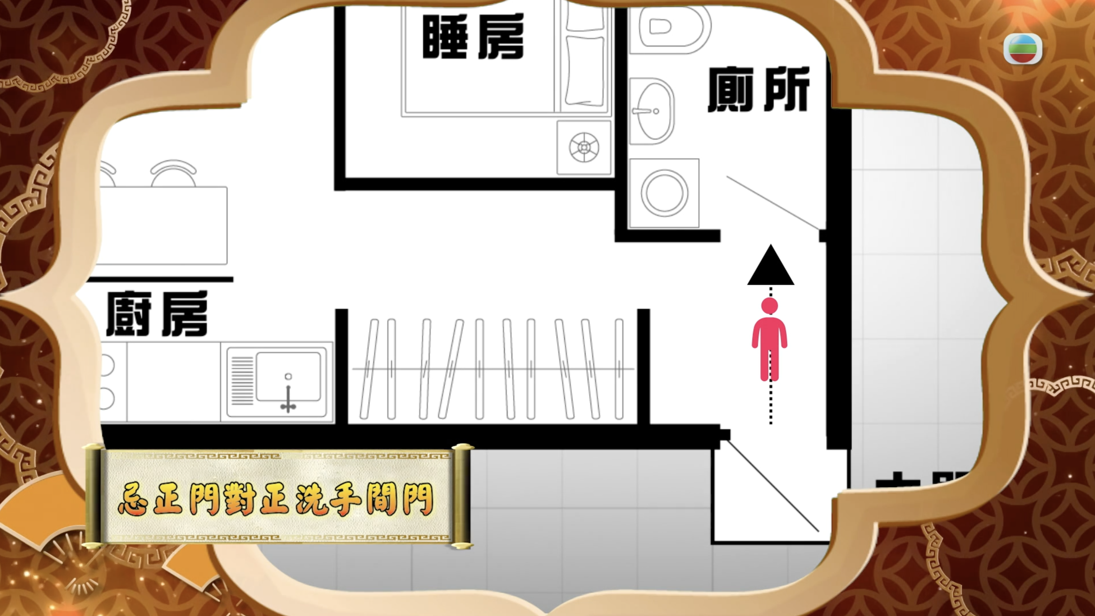 - 廚房代表家中女主人的地位。不利女主人,會令其地位低下、易發脾氣及多爭執,令全家爭執也多,不利家運。