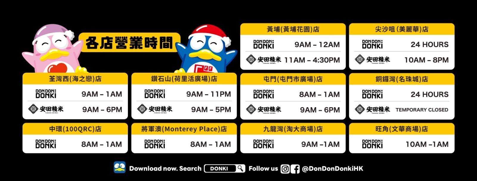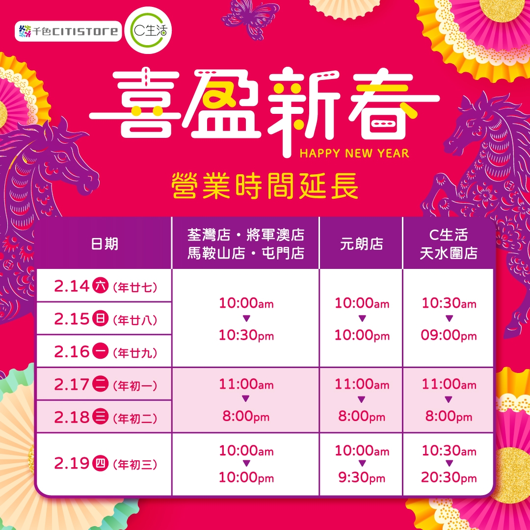 - 年初三(2月19日): 10am-10pm(荃灣、將軍澳、馬鞍山、屯門店)、10am-9:30pm(元朗店)、10:30am-8:30pm(天水圍店)