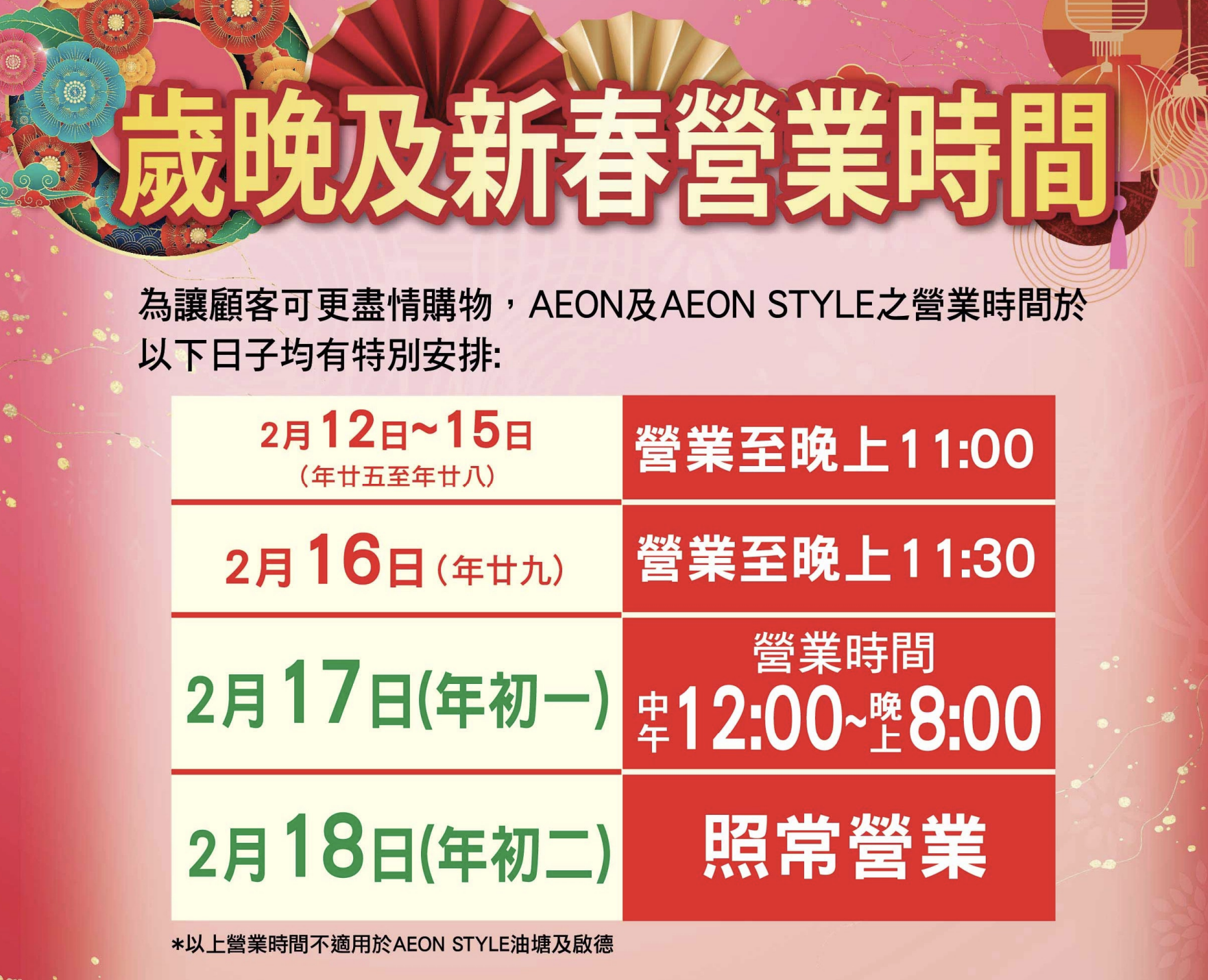 - 年廿九(2月16日):延長營業至11:30pm(AEON及AEON STYLE,油塘店除外)、延長營業至11:30pm(啟德店)、延長營業至11pm(Mono Mono 及指定 Living Plaza)