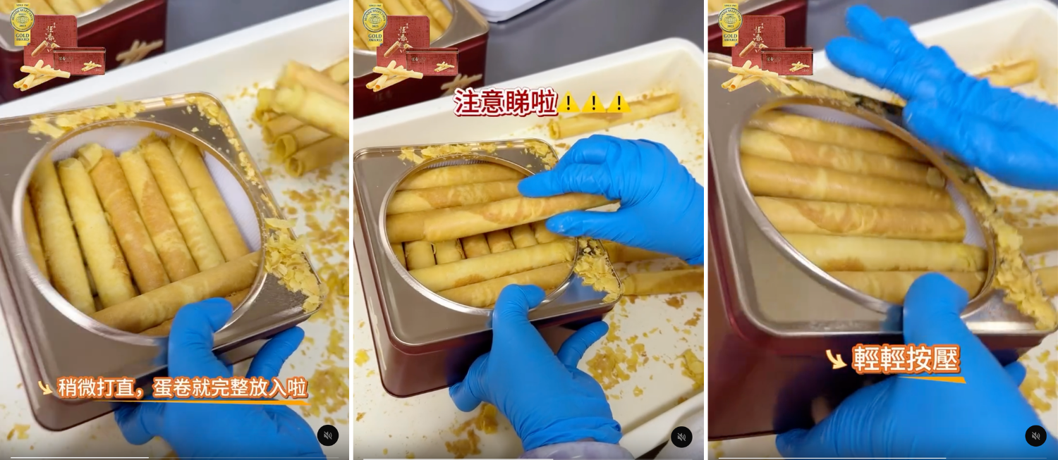 至於最後一條蛋卷,就喺罐中央輕輕按壓落去。姐姐示範話,呢個方法確保每罐蛋卷都裝得密密實實,唔浪費空間。