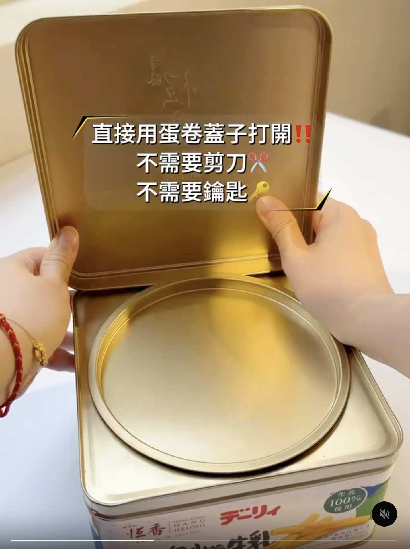 只要罐裝蛋卷的頂蓋邊,把內部的圓形罐蓋撬起即可,唔使用鉸、唔使用鎖匙!