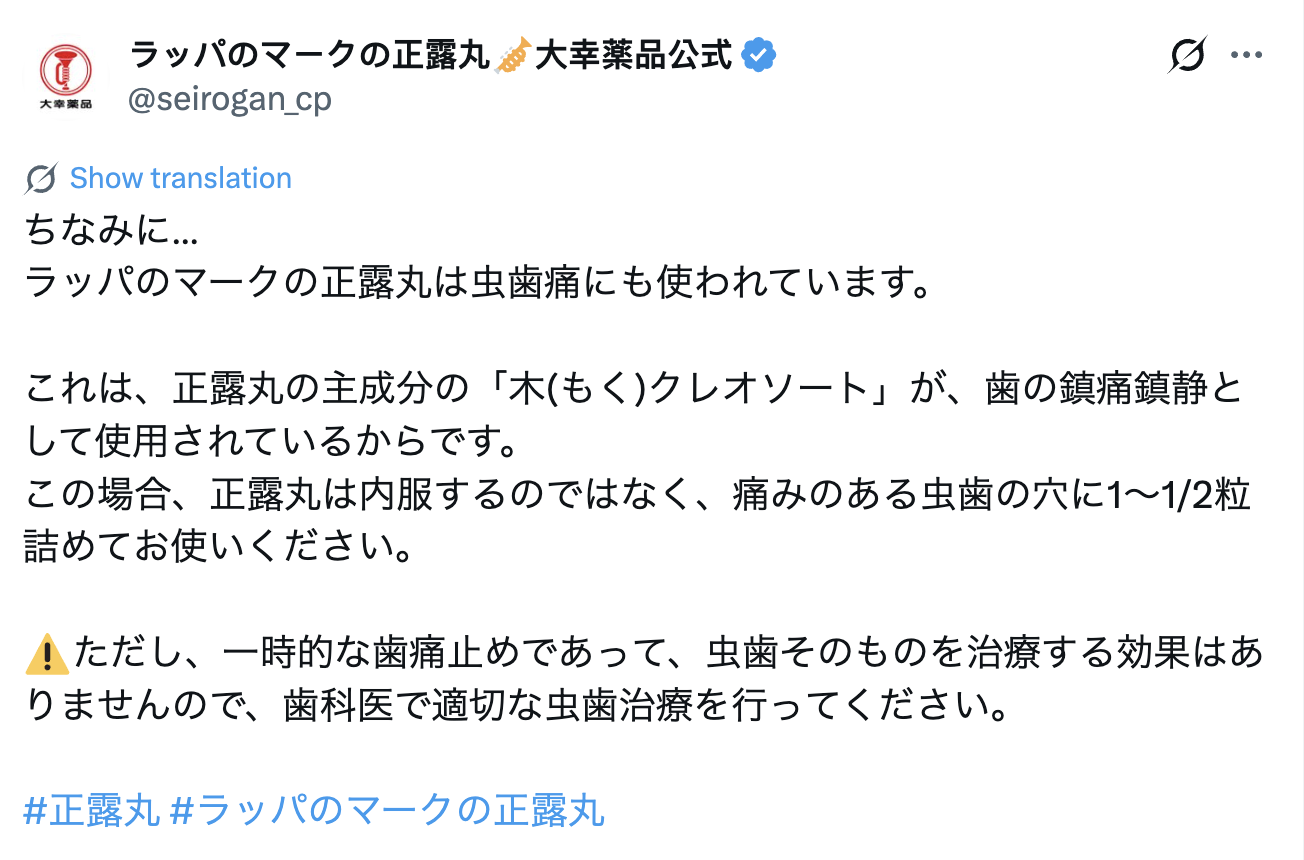 【牙痛急救/平安藥/止牙痛/日本藥品】家家戶戶必備的喇叭牌正露丸原來不止止肚瀉,還有隱藏功能可以快速止牙痛!日本大幸藥品官方說明書明確指出,齲齒痛時可把1至1/2粒填入蛀洞內,靠木餾油成分殺菌鎮痛,緊急緩解不適。香港人半夜牙痛無牙醫?即學官方正確操作,避免越弄越痛!記住只是暫時救急,之後一定要睇牙醫根治。
