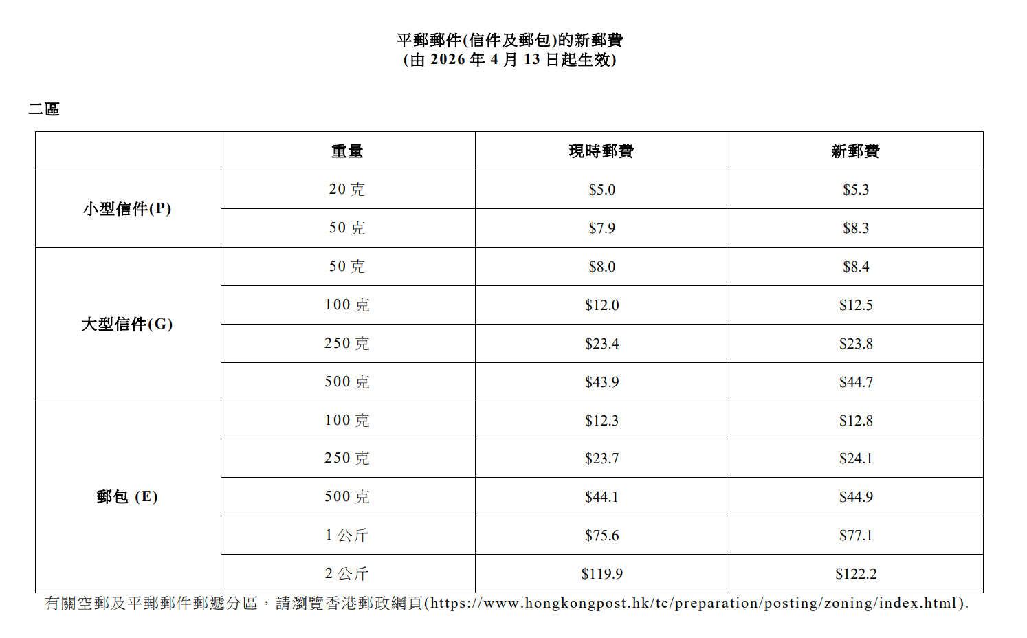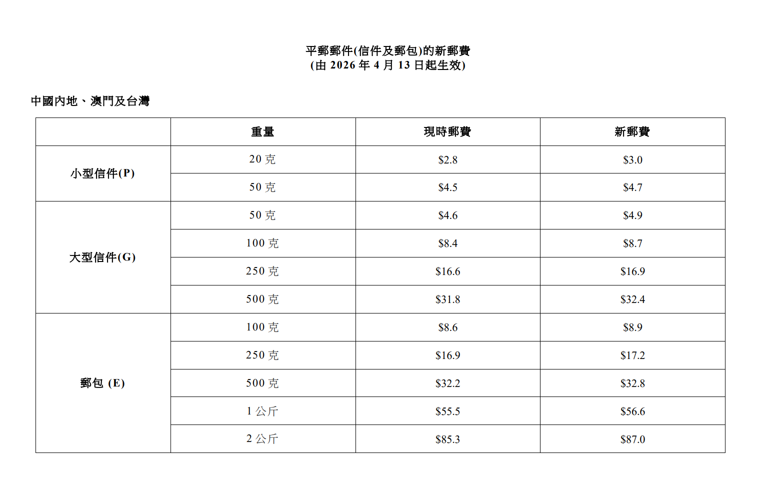 - 平郵信件:20克或以下寄往中國內地、澳門和台灣的郵費由現時2.8元調整至3元,而寄往其他地區的郵費由3.5至5.3元調整至3.7至5.6元不等。