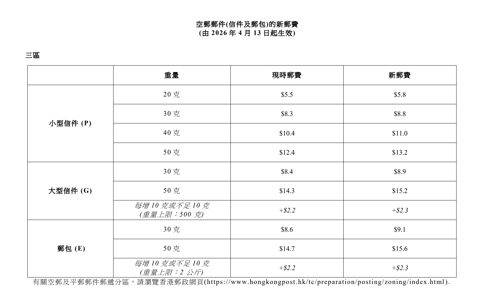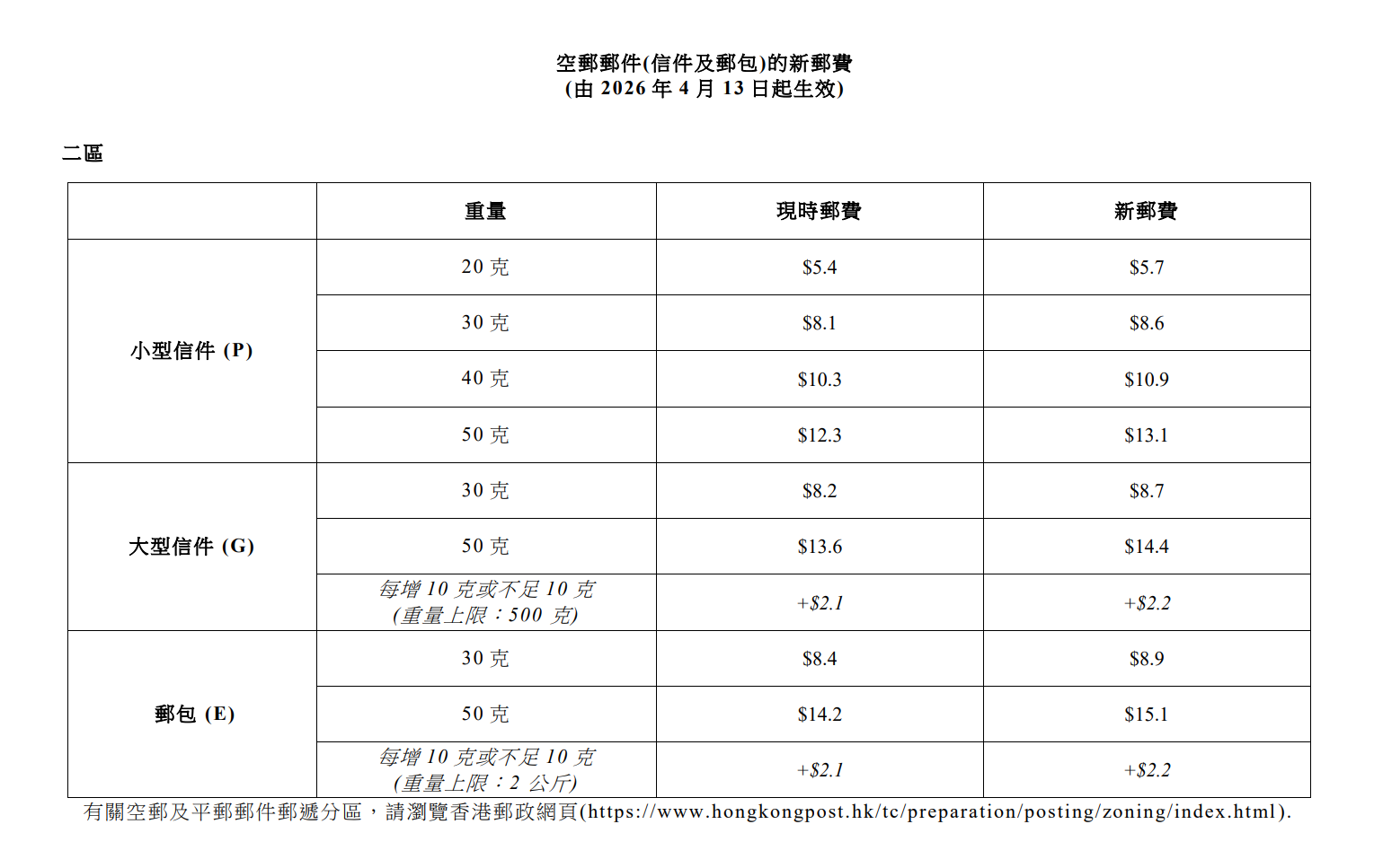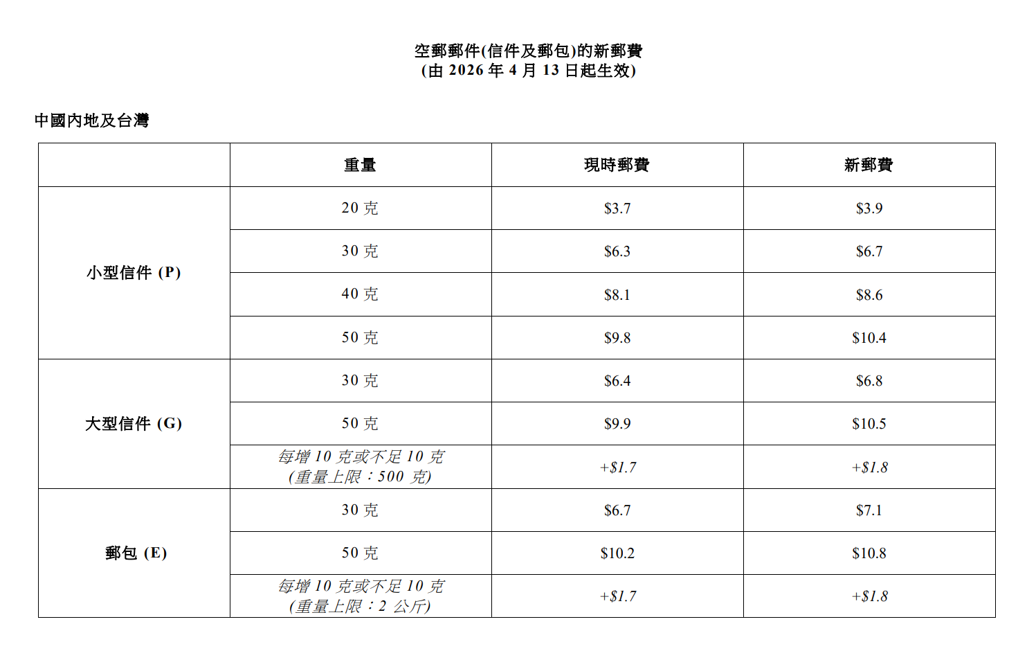 - 空郵信件:20克或以下寄往中國內地和台灣的郵費由現時3.7元調整至3.9元,而寄往其他地區的郵費由4至5.5元調整至4.2至5.8元不等;以及
