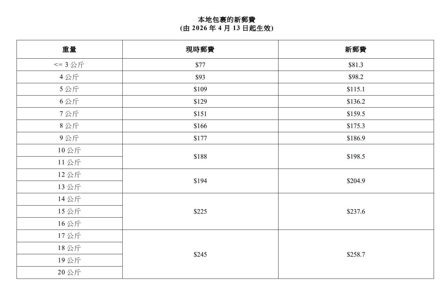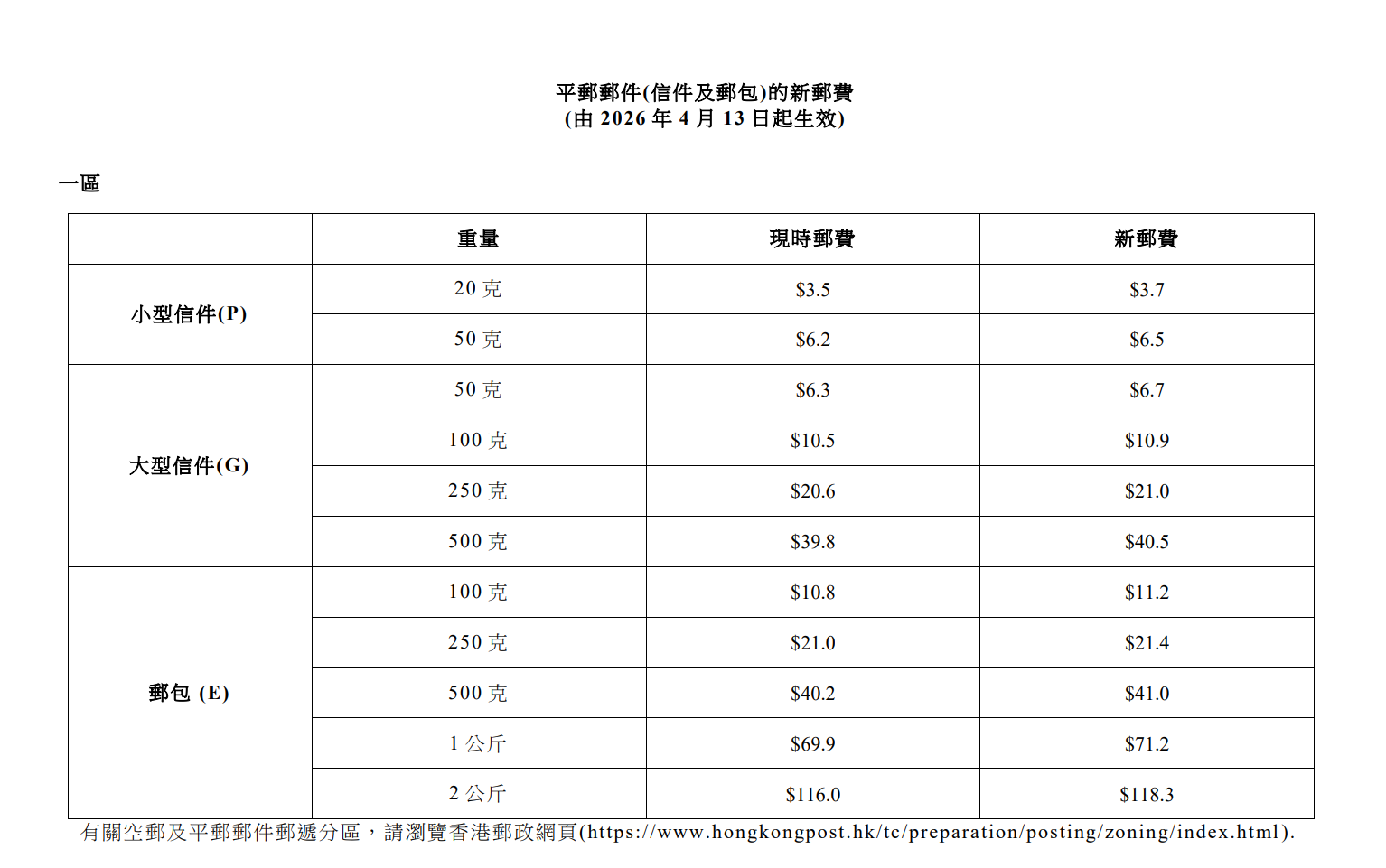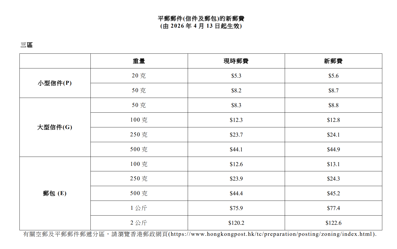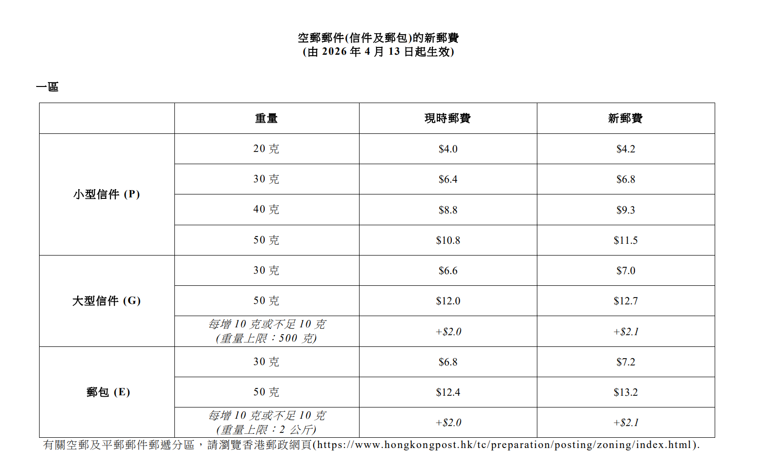- 空郵信件:20克或以下寄往中國內地和台灣的郵費由現時3.7元調整至3.9元,而寄往其他地區的郵費由4至5.5元調整至4.2至5.8元不等;以及