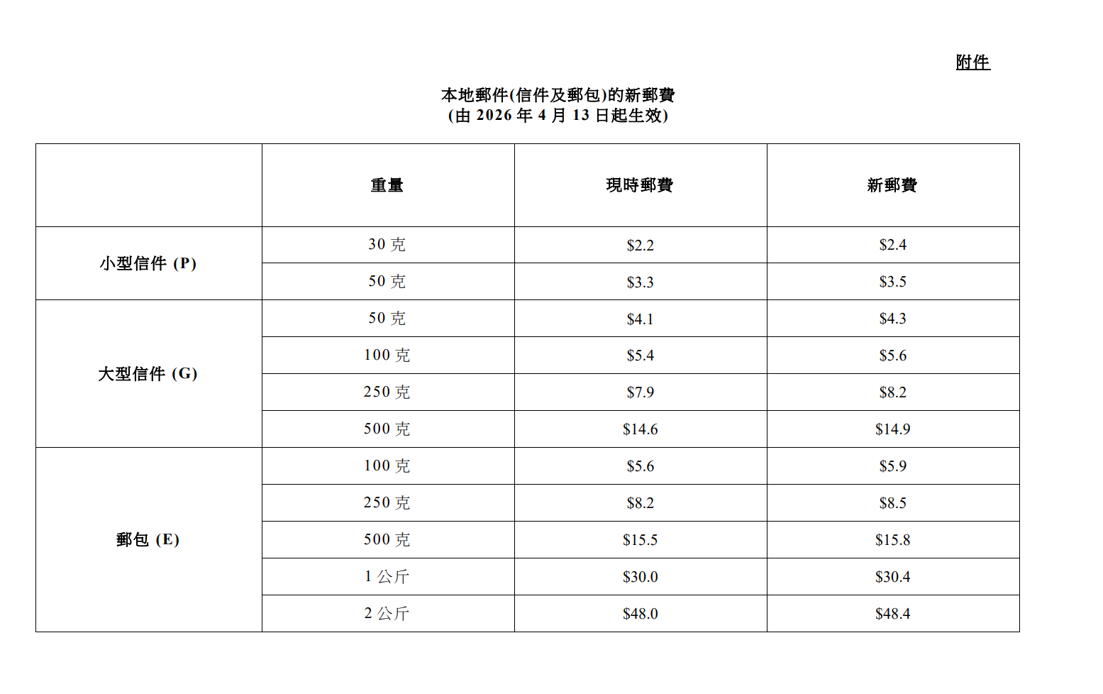 【郵費/調整/本地/平郵/信件/加價/包裹/空郵/收費】香港郵政昨日(23日)宣布,將於4月13日起調整主要郵費。投遞信件方面,有關基本級別郵費調整大致如下。