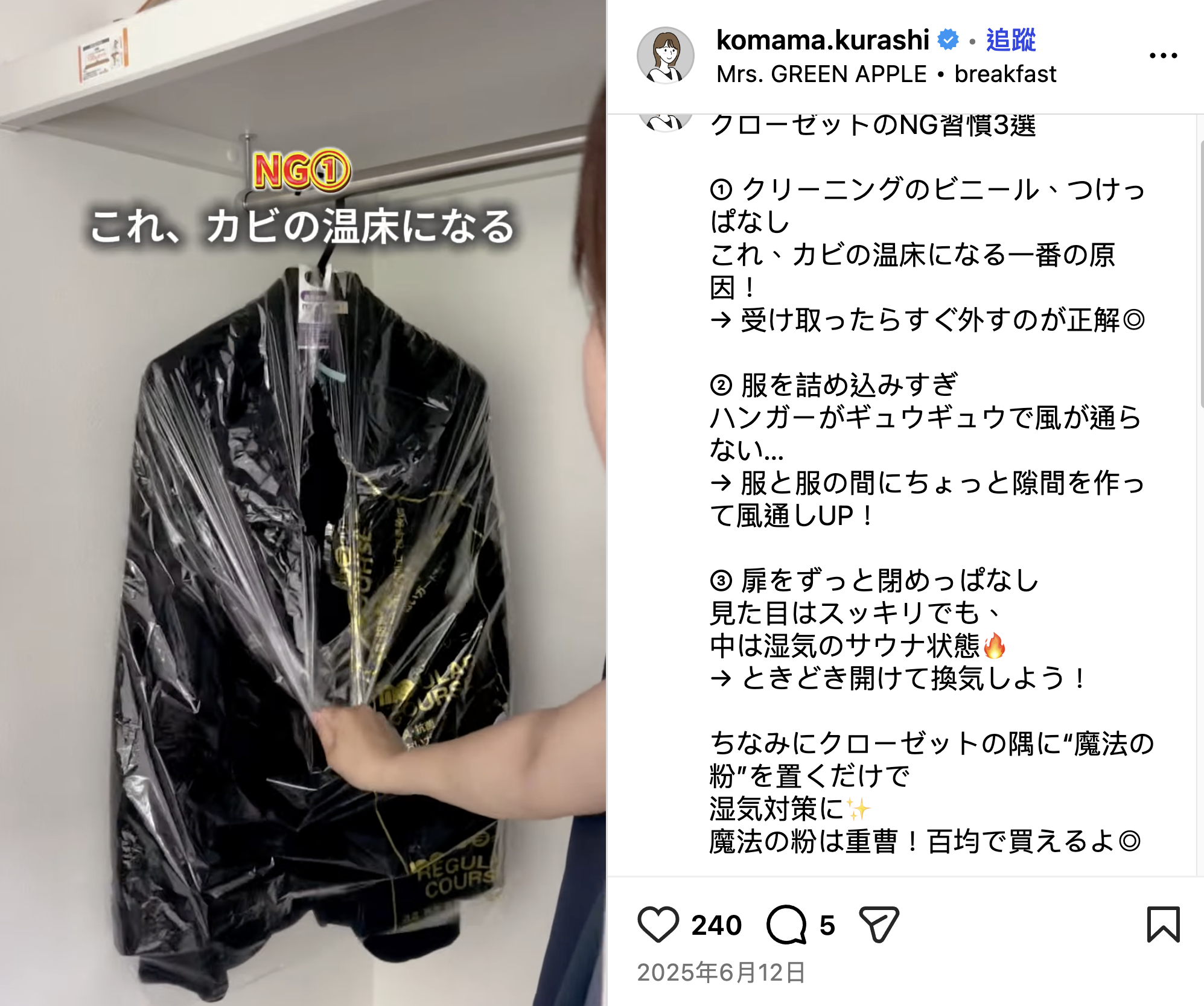 香港春夏潮濕,衣櫃內濕氣重,加上不少人習慣把乾洗店交回的衣物連膠袋一起掛起或摺好收納,以為可以防塵,結果原因膠袋阻礙空氣流通,殘留的乾洗溶劑及衣物上的微量水分無法揮發,容易滋生霉菌致衣物發霉。IG網友Komama在日本家事網站《grape》上分享,這些看似方便的做法,其實是衣物發霉的隱形殺手。