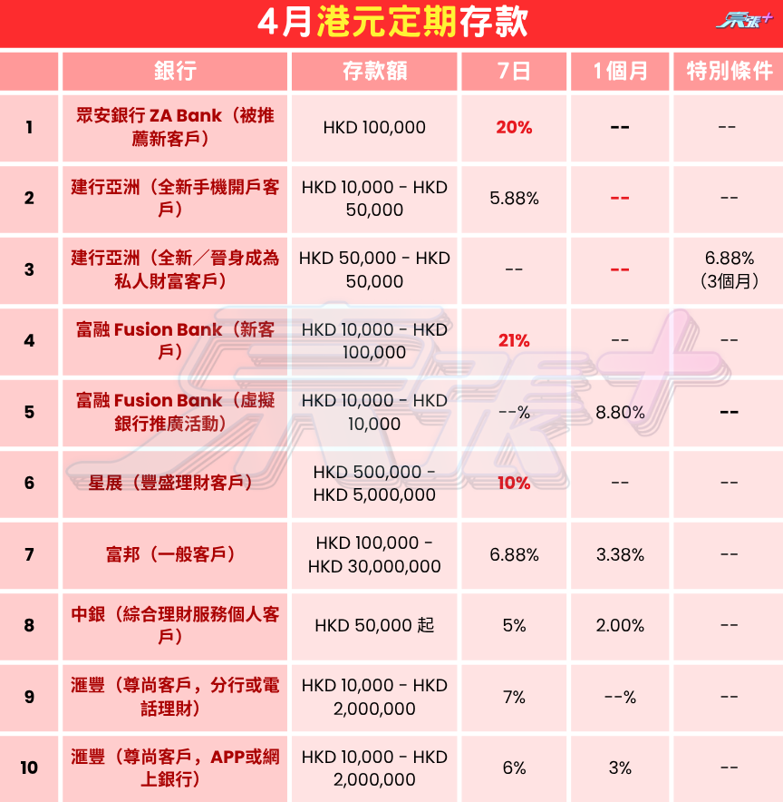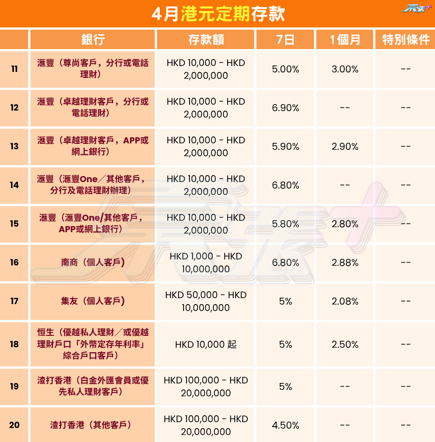 ✅ 特別條件:全新/晉身成為私人財富客戶,以合資格資金(為客戶資產管理總值之20%,上限為等值50萬港元)開立3個月定期存款,可享高達6.88%特惠定存年利率。
