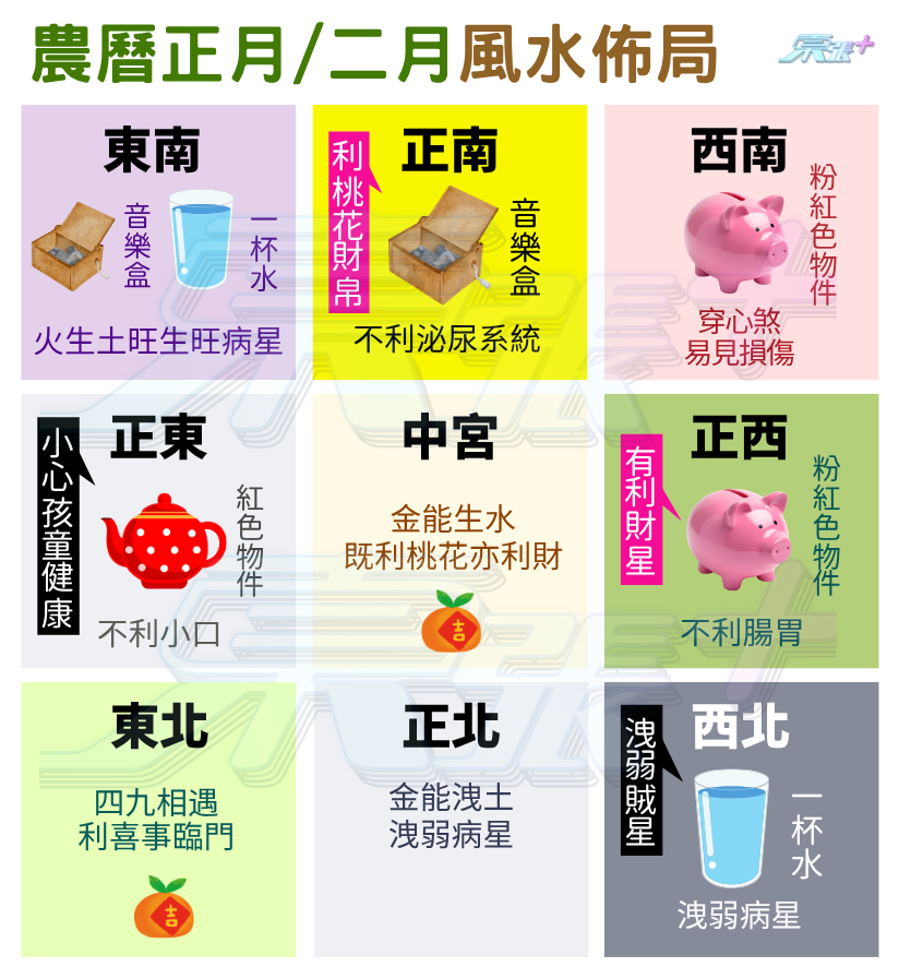 東南|本年東南為九紫火,本月東南為五黃土,火生土旺而生旺病星,宜放音樂盒及一杯水洩土制火。