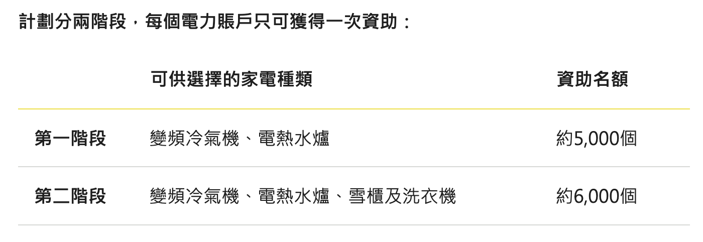 中電透過「中電社區節能基金」推出此計劃,資助合資格人士更換耗電高的家電為一級能源標籤型號。 每戶最多買兩種家電,每種一件,資助為訂單總額七成或$2700,以較低者為準。 第一階段已結束,第二階段聚焦四類電器,幫助長者夏天省電。(更多詳情可按此連結查看)