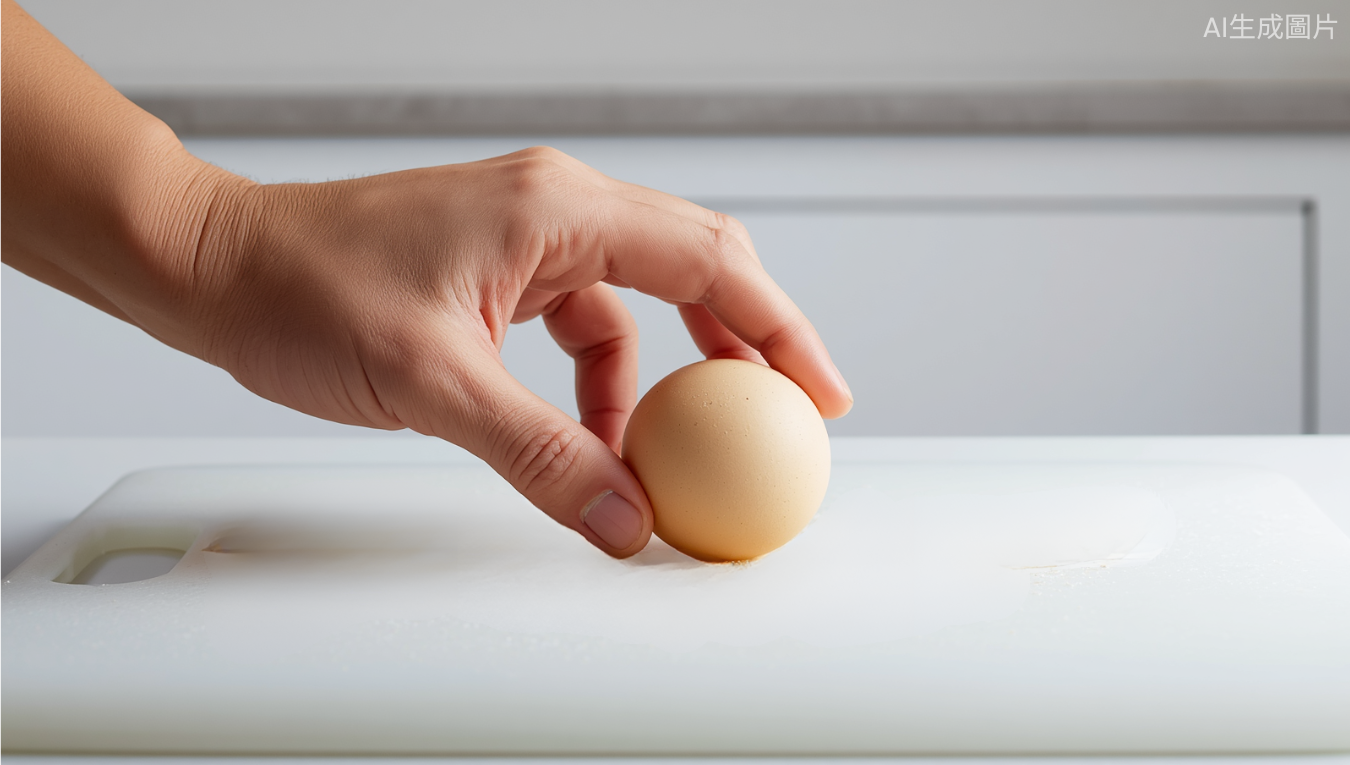 - 將雞蛋放在平坦、堅硬、已清潔表面(如砧板/料理枱)輕敲一下。