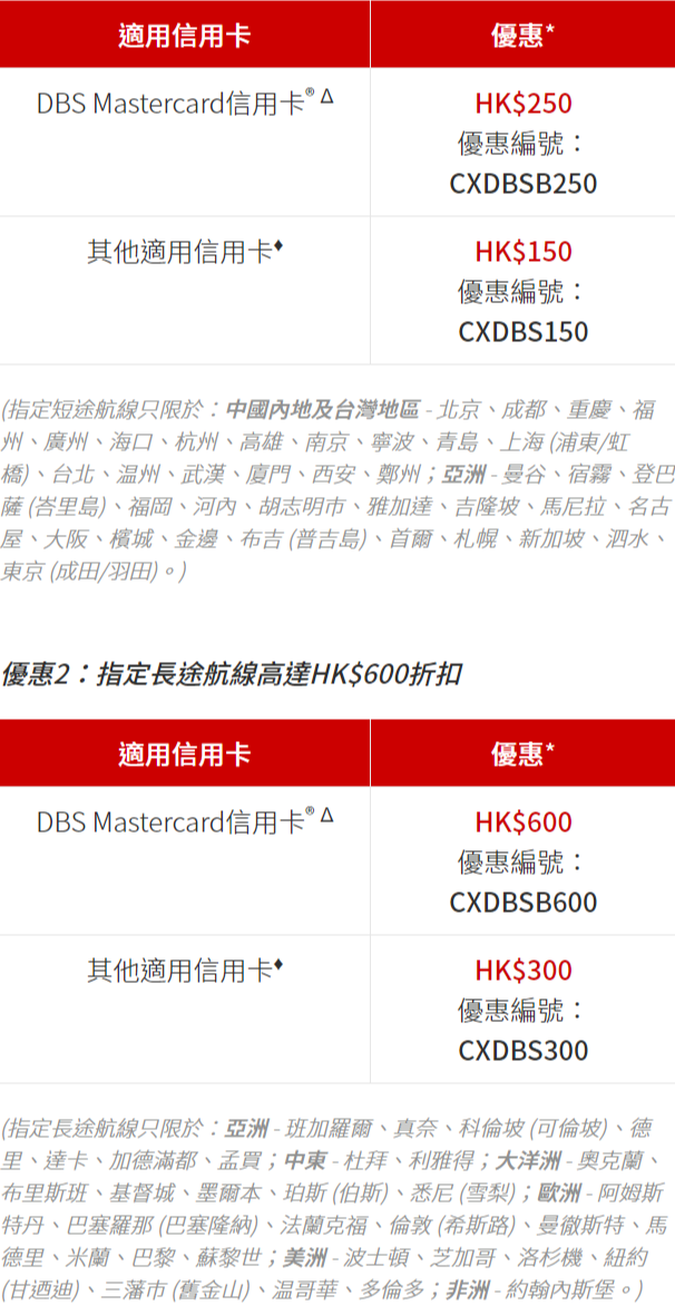 憑適用DBS信用卡於國泰航空指定網站,在推廣期內預訂由香港出發到指定目的地機票,並於付款前於優惠編號欄內輸入指定優惠編號,可享最高$600折扣優惠!