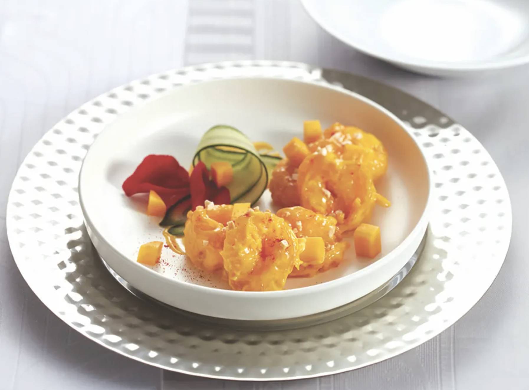 二人下午茶套餐包括鹹點:柚子醬香脆帶子、黑蒜蟹肉燒賣、紅甜椒蘆筍鮮蝦餃皇、紅寶石雞肉酥、和風脆炸煙三文魚卷; 甜點:荔枝汁漬荷蘭小串茄、黃 「柑」香橙菲林卷、茉莉花奶凍及飲品;弓竹口花圖精選花茶或無酒精雞尾酒 2 杯。