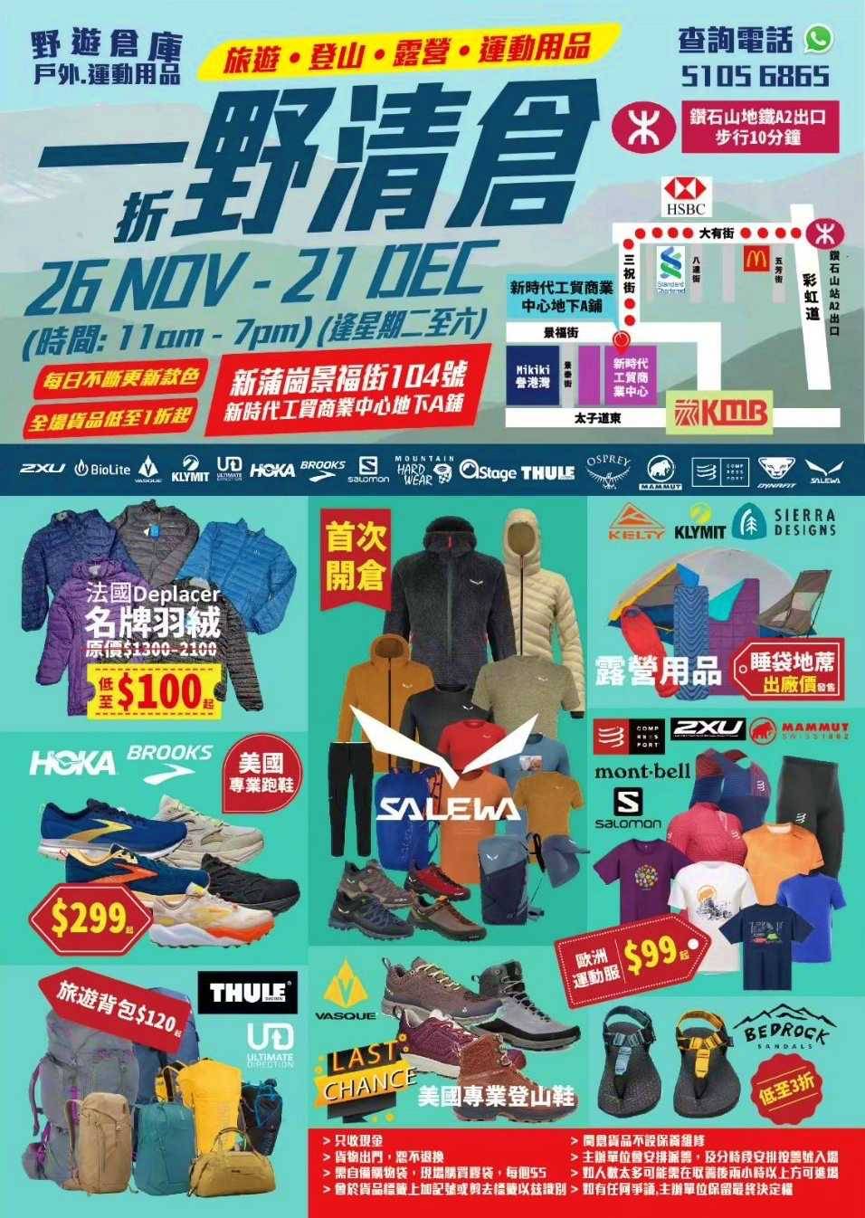 而家嘅經濟環境,當然要慳得一蚊得一蚊,買嘢梗係要等特價同減價,咁本周末你就有地方好去了。戶外及運動用品店野遊倉庫由即日至 12 月 21 日於新蒲崗開倉,不少山系及運動名牌產品會減價發售,最癲一定是法國 Deplacer 羽絨低至 $100 起,真係平過 U 記、B 記!而近年大熱的跑鞋 HOKA 也由 $299 起,瑞典名牌 THULE 山系背囊及其他旅行背包 $120 起及歐洲運動服 $99 起,露營用品也有特價,睡袋地蓆更以出廠價發售、Bedrock 涼鞋低至 3 折,最平產品只是 $10。